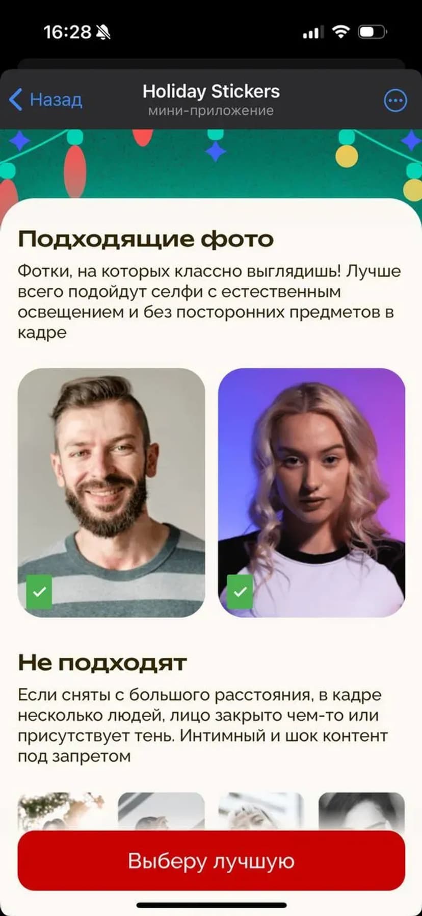 Holiday Stickers автоматически превращает загруженные фотографии в праздничные стикеры, добавляя тематические украшения — шапки Деда Мороза, мишуру, снежинки и другие элементы.