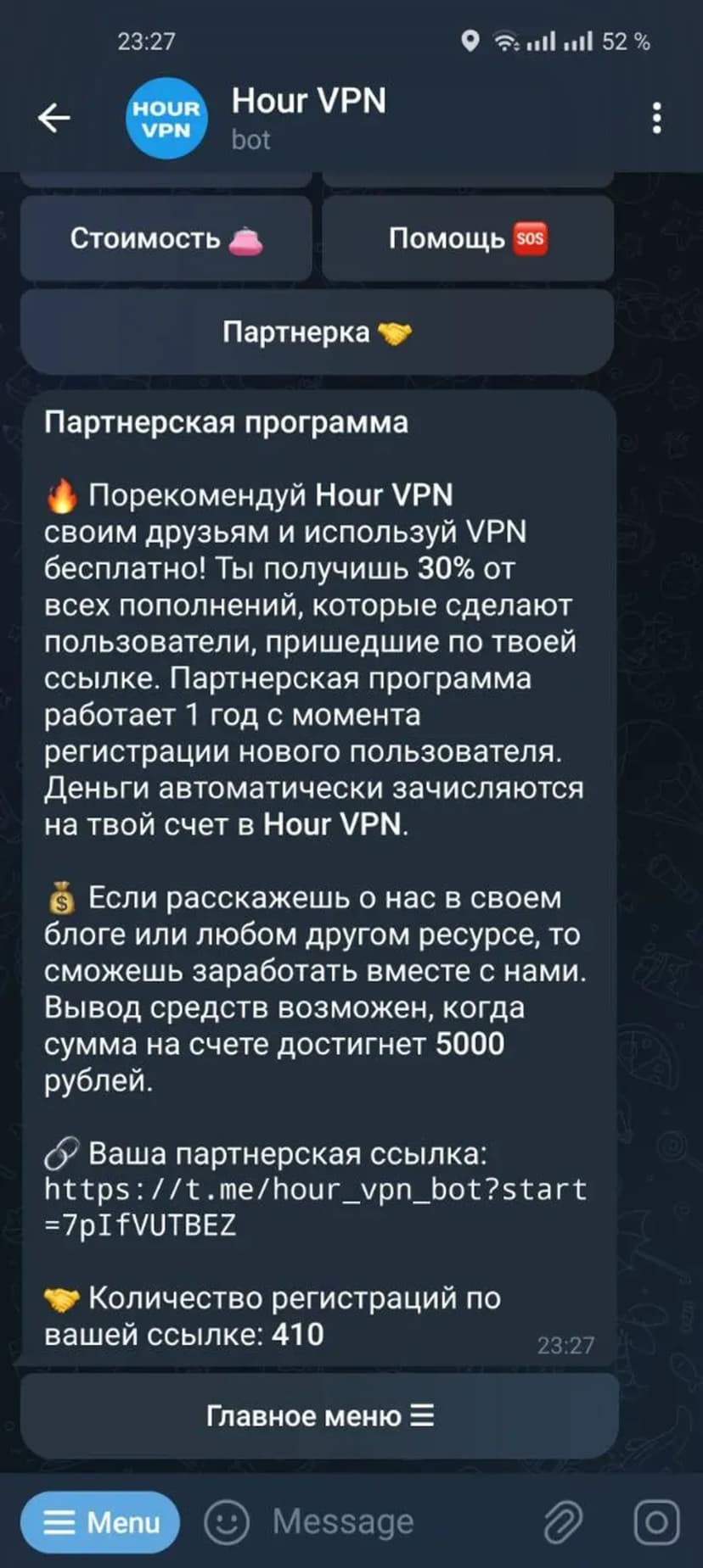 Оплата осуществляется поминутно — 6 рублей в сутки за один ключ, что делает сервис удобным как для краткосрочных подключений, так и для регулярного использования. Для привлечения пользователей реализована реферальная программа: 30% от оплат приглашённых начисляется на счёт пригласившего.