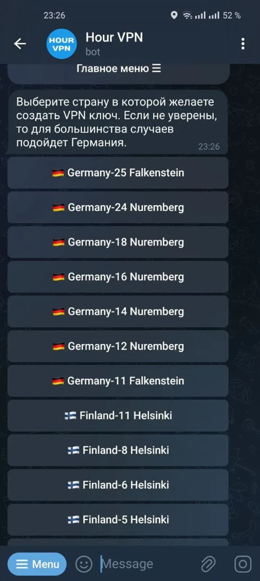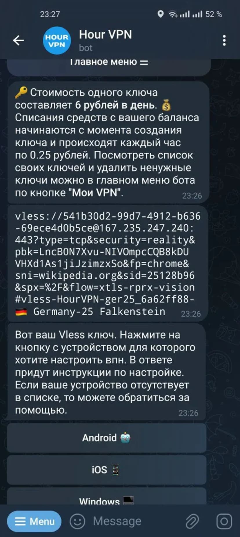 Hour VPN позволяет получать VPN‑ключи напрямую через Telegram: выбираете сервер и мгновенно генерируете ключ для доступа через поддерживаемые протоколы Outline (ShadowSocks), VLESS и WireGuard.