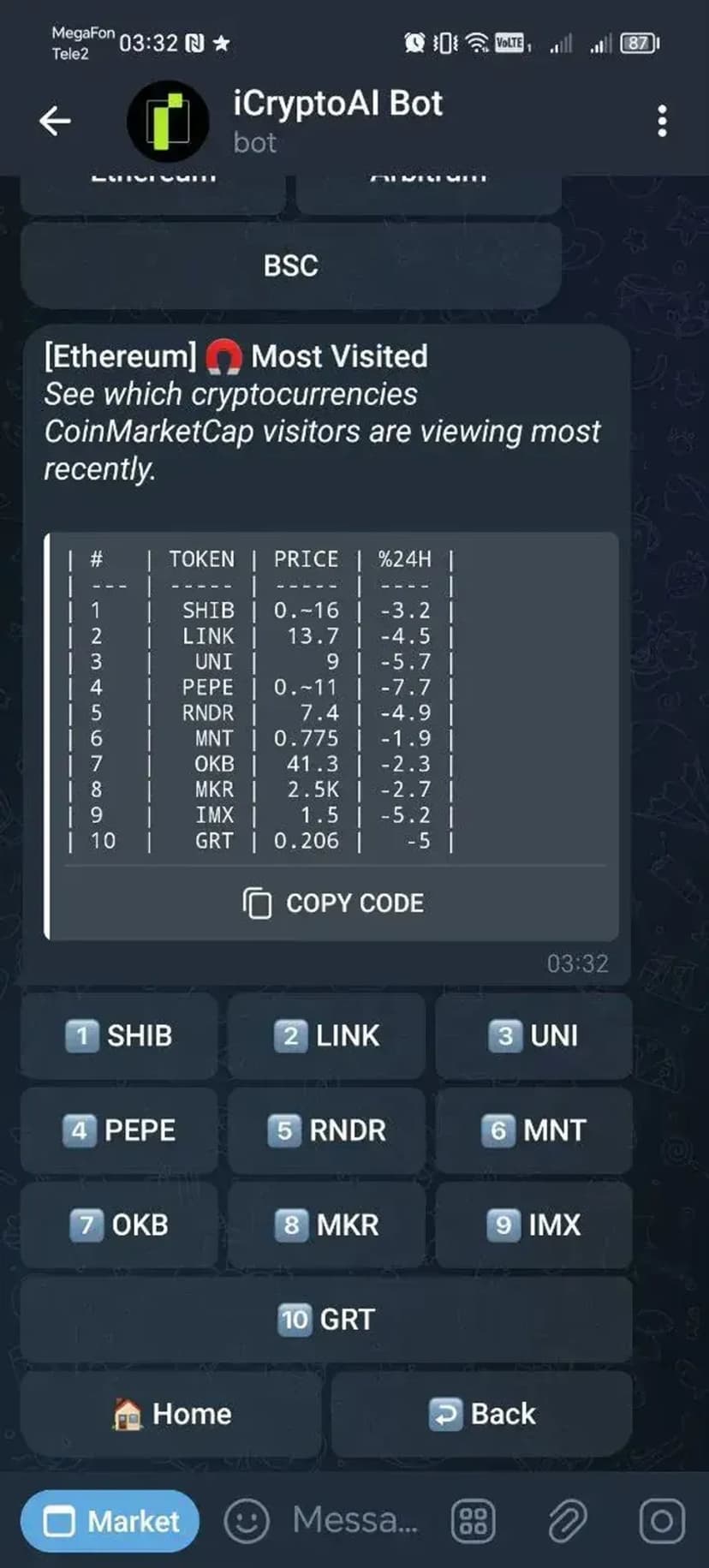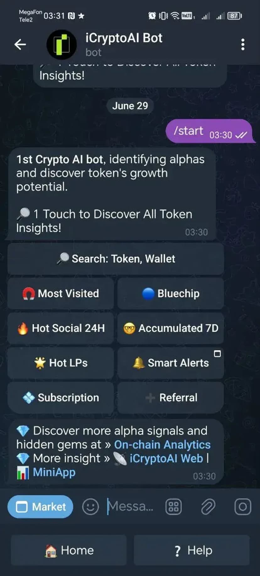iCryptoAI Bot использует искусственный интеллект для анализа криптовалютных токенов и выдаёт оценку их потенциала роста и сопутствующих рисков.