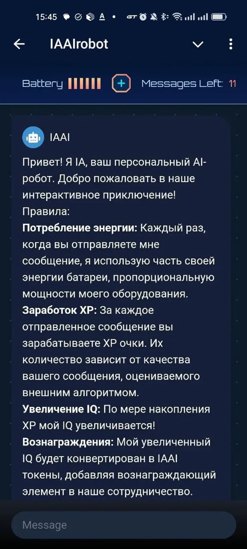 IAAIrobot — игра на блокчейне TON, сочетающая 3D-робототехнику, искусственный интеллект и NFT. Взаимодействуйте с ИИ-роботом, который прогрессирует по мере общения и выполнения заданий, получая внутриигровые награды и токены.