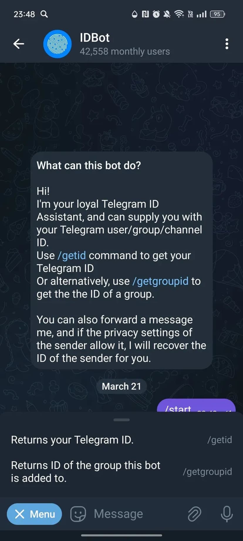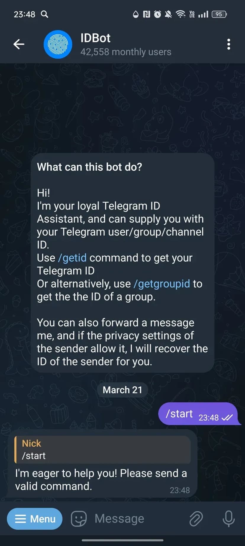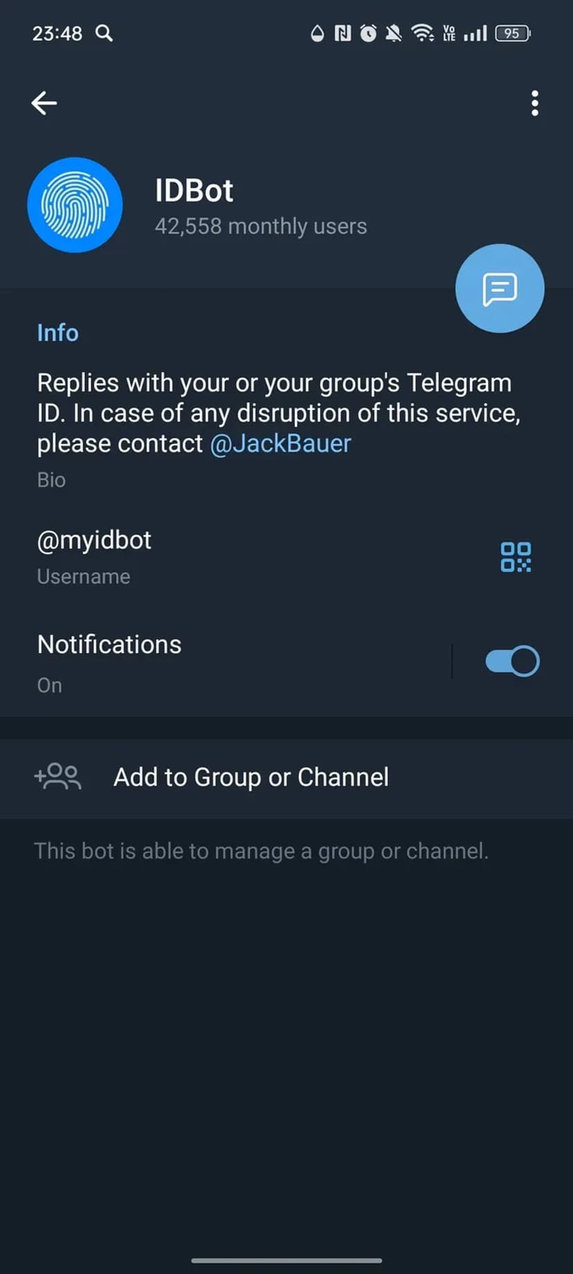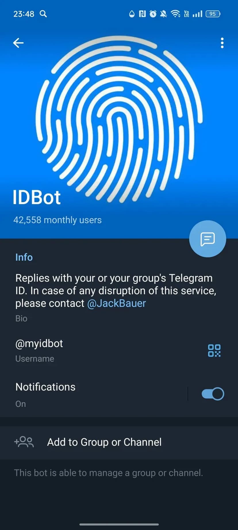 IDBot мгновенно возвращает Telegram ID пользователя или группы при взаимодействии с ботом.