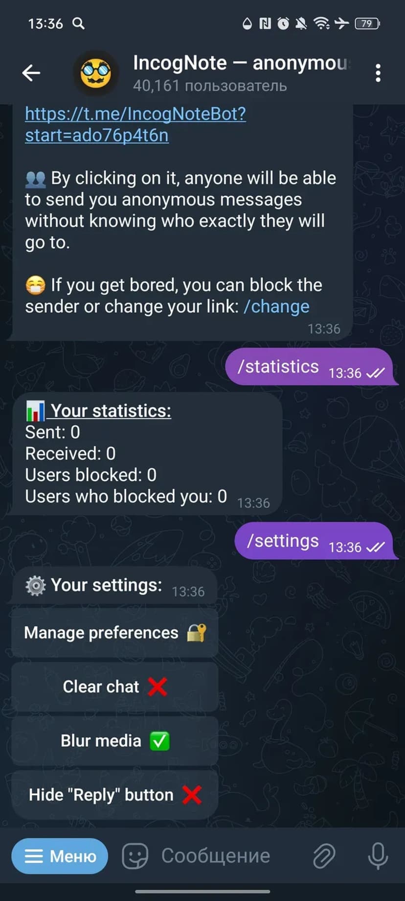 IncogNote — anonymous messages позволяет обмениваться полностью анонимными сообщениями через персональную ссылку, не требуя отдельной регистрации или сторонних приложений. Взаимодействие происходит непосредственно внутри Telegram, а вся логика реализована на стороне бота.