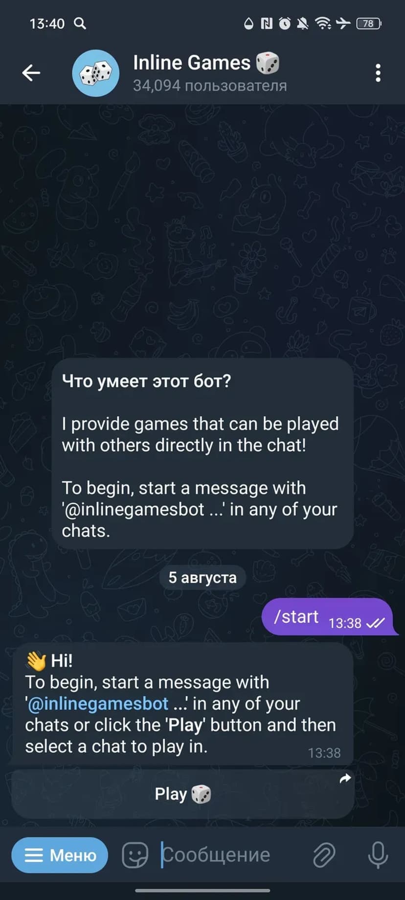 - ΠΠ°ΠΏΡΡΠΊ: Π²Π²Π΅Π΄ΠΈΡΠ΅ ΠΊΠΎΠΌΠ°Π½Π΄Ρ Π±ΠΎΡΠ° Π² ΠΏΠΎΠ»Π΅ ΡΠΎΠΎΠ±ΡΠ΅Π½ΠΈΡ ΠΈ Π²ΡΠ±Π΅ΡΠΈΡΠ΅ ΠΈΠ³ΡΡ ΠΈΠ· ΡΠΏΠΈΡΠΊΠ°.