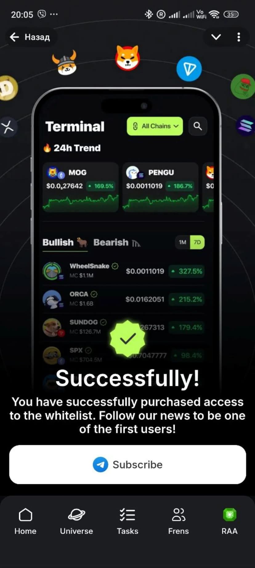 Для работы нужен аккаунт Telegram. Часть функций доступна после регистрации или по подписке. Приложение интегрировано с RateX.ai и поддерживает взаимодействие с внешними Web3-сервисами.
