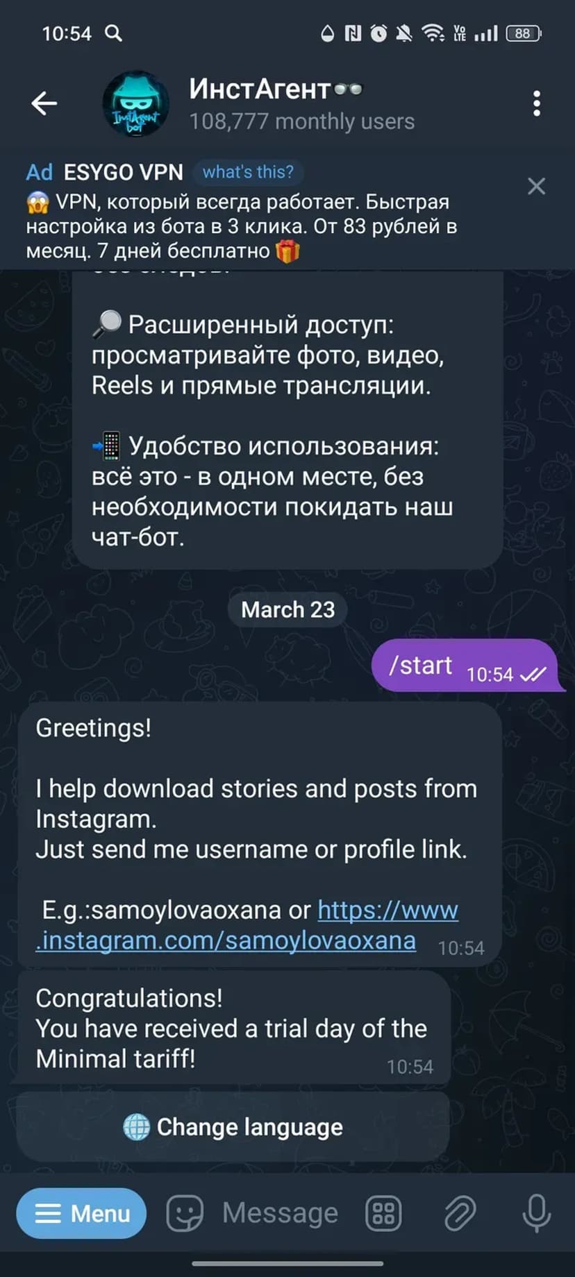 Сохранение сторис, постов, фото и видео из открытых профилей Instagram через бота