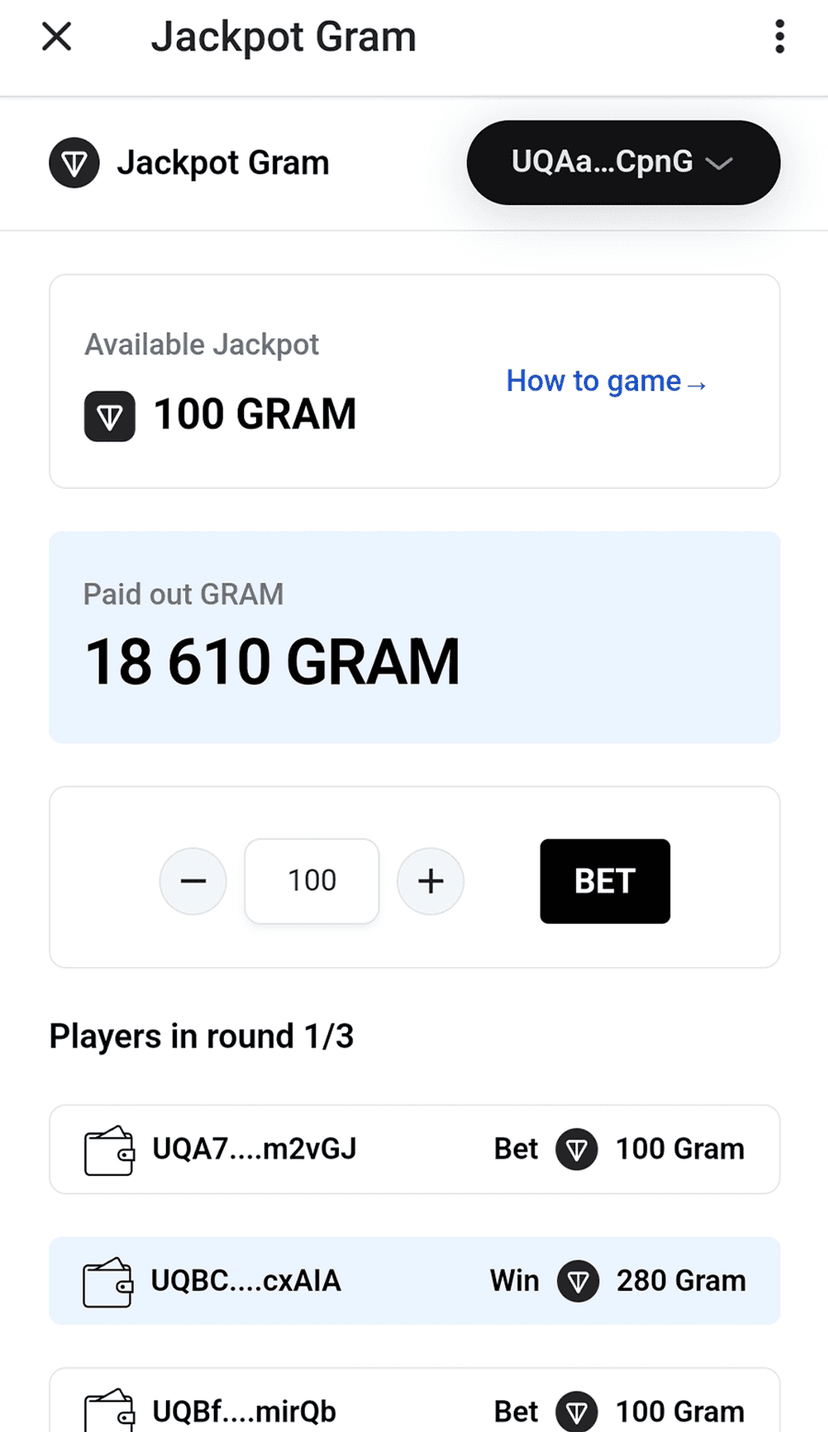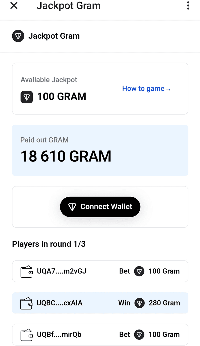 Jackpot Gram проводит децентрализованные лотереи на базе смарт-контракта с использованием токена $GRAM. Призовой фонд формируется из взносов участников, а победитель определяется автоматически смарт-контрактом — всё прозрачно и без ручного вмешательства организаторов.