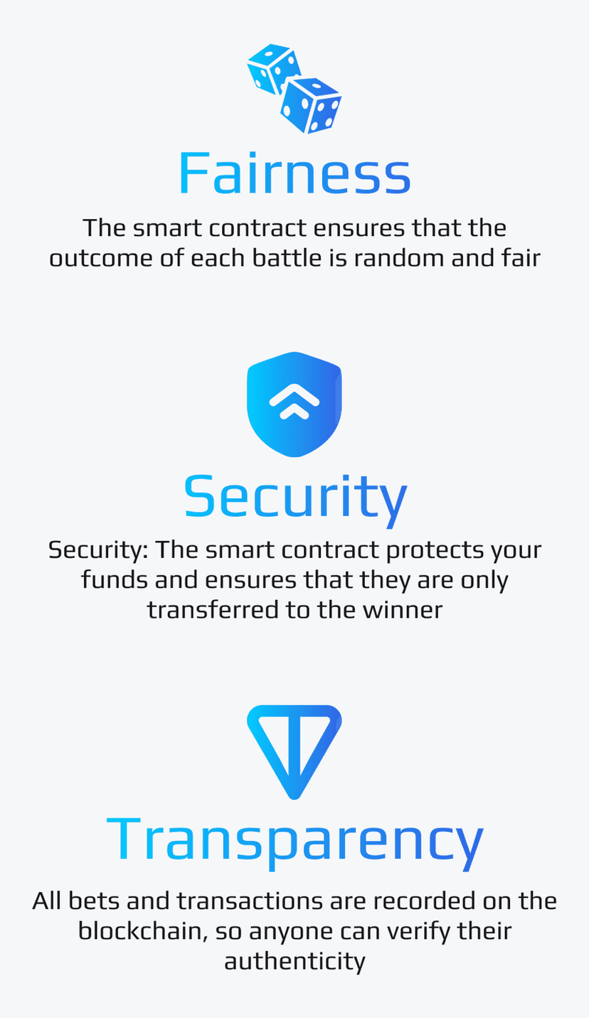 Участники делают ставки в токенах TON: для игры требуется Telegram‑аккаунт и TON‑кошелек. Победитель определяется случайно смарт‑контрактом, а все действия и выплаты записываются в блокчейн и доступны для проверки.