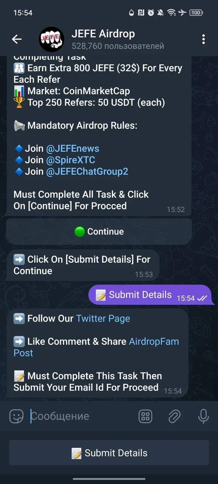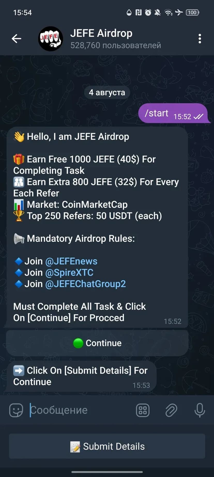 *Нажимая "Открыть в Telegram", вы перейдете к приложению JEFE Airdrop в мессенджере Telegram
