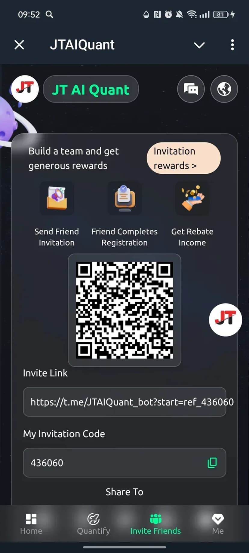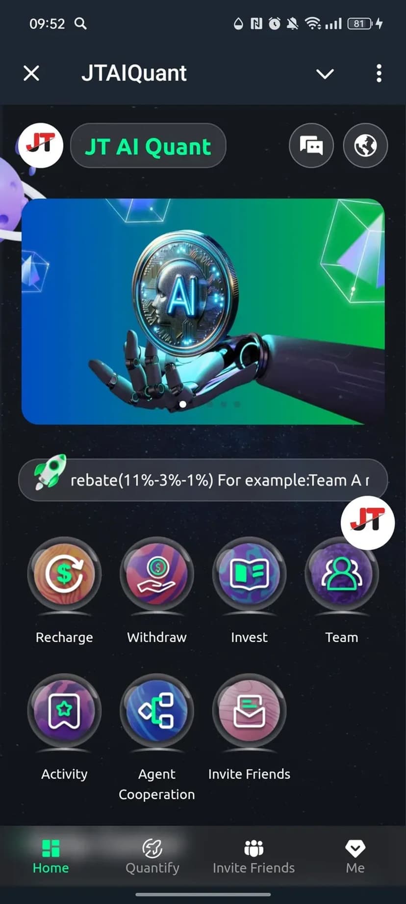 JTAIQuant — мини‑приложение в Telegram для автоматизации торговли криптовалютами с поддержкой USDT. Платформа интегрируется с Telegram и предоставляет инструменты для управления торговыми стратегиями, автоматического исполнения ордеров и мониторинга доходности.
