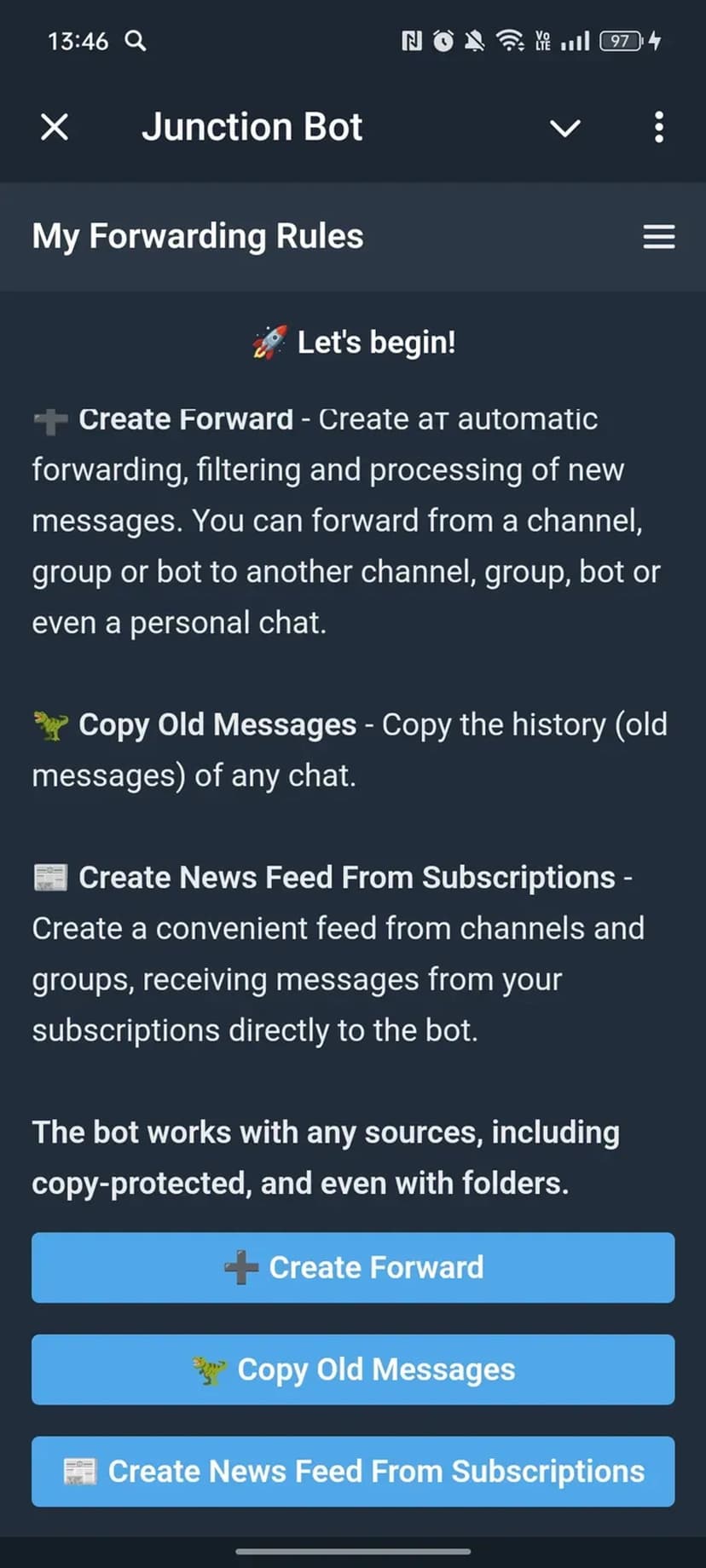 Junction Bot обеспечивает автоматизацию пересылки и агрегирования контента в Telegram: перенаправление новых сообщений между чатами, каналами и группами, импорт истории переписок и объединение публикаций из подписок в единую ленту.
