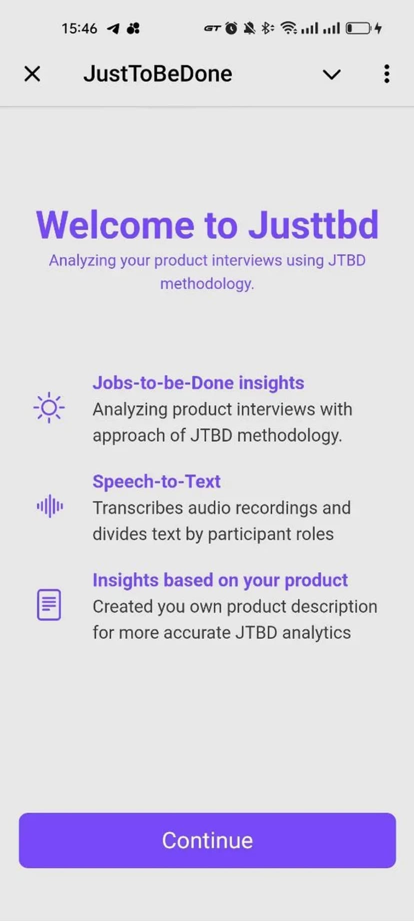 JustToBeDone выполняет автоматическую распознавание речи и структурирует пользовательские интервью по методологии Jobs‑To‑Be‑Done, помогая командам быстро получать продуктовые инсайты.