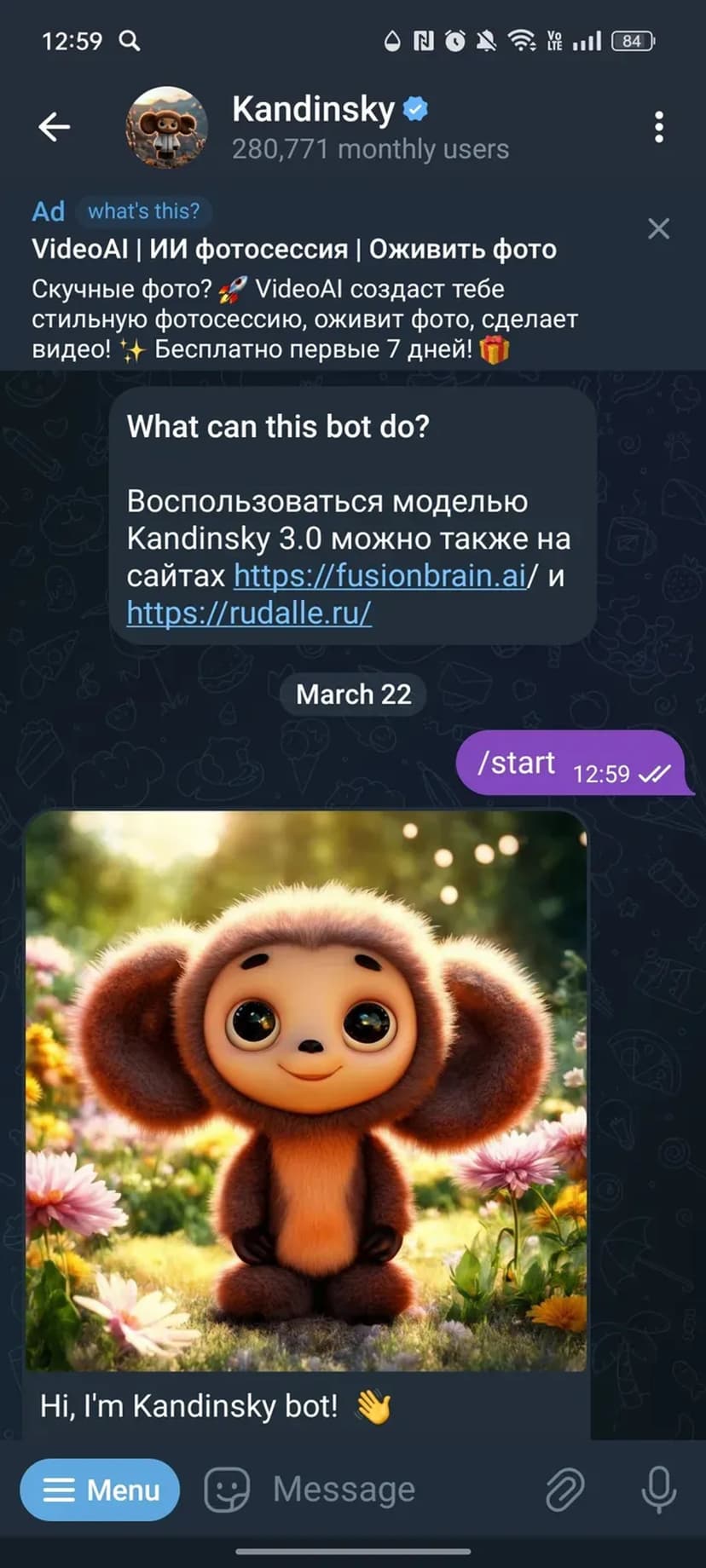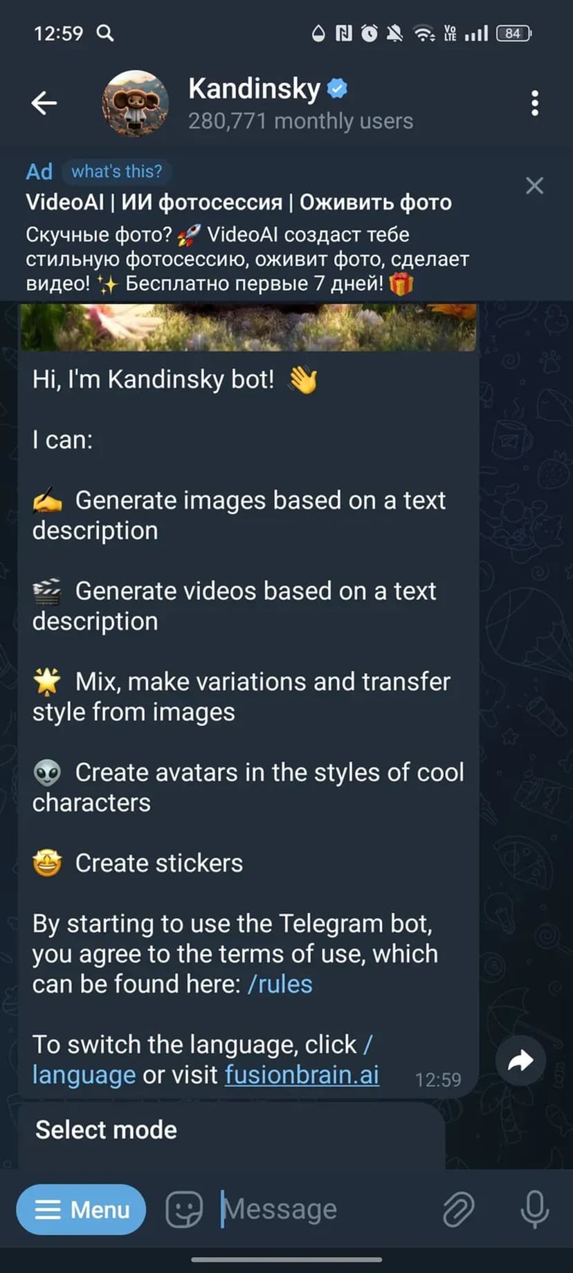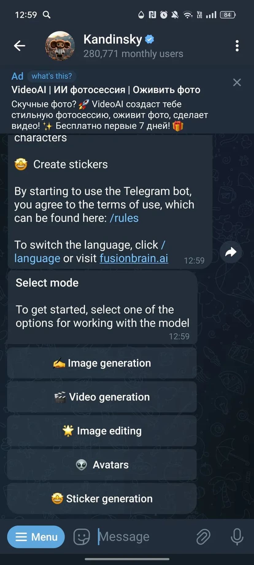 Kandinsky by Sber AI выполняет генерацию изображений и коротких видеороликов по текстовым описаниям прямо в Telegram. Сервис также умеет создавать вариации картинок, переносить стиль между изображениями, смешивать несколько изображений и быстро формировать аватарки и стикеры в разных визуальных решениях.