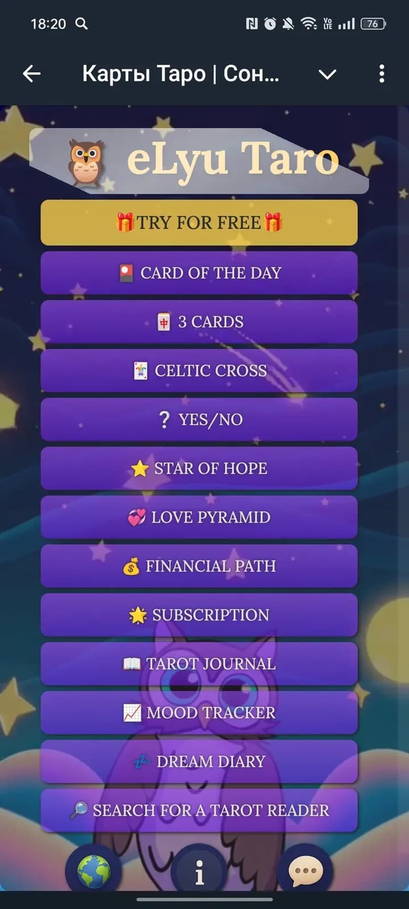 Приложение объединяет три инструмента: автоматические расклады Таро, сонник с поиском по ключевым словам и персональный дневник для записи наблюдений и инсайтов.