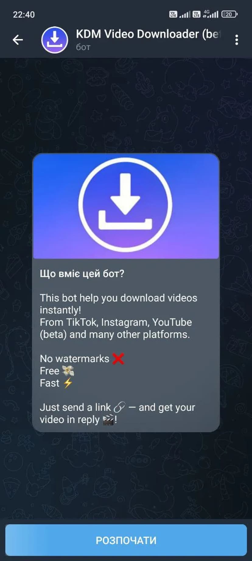 KDM Video Downloader • beta — мини‑приложение для быстрого сохранения видеороликов из TikTok, Instagram, YouTube и других популярных платформ. Отправьте ссылку в чат с ботом, и он автоматически обработает её, возвращая видео без водяных знаков и без ограничений по скорости.