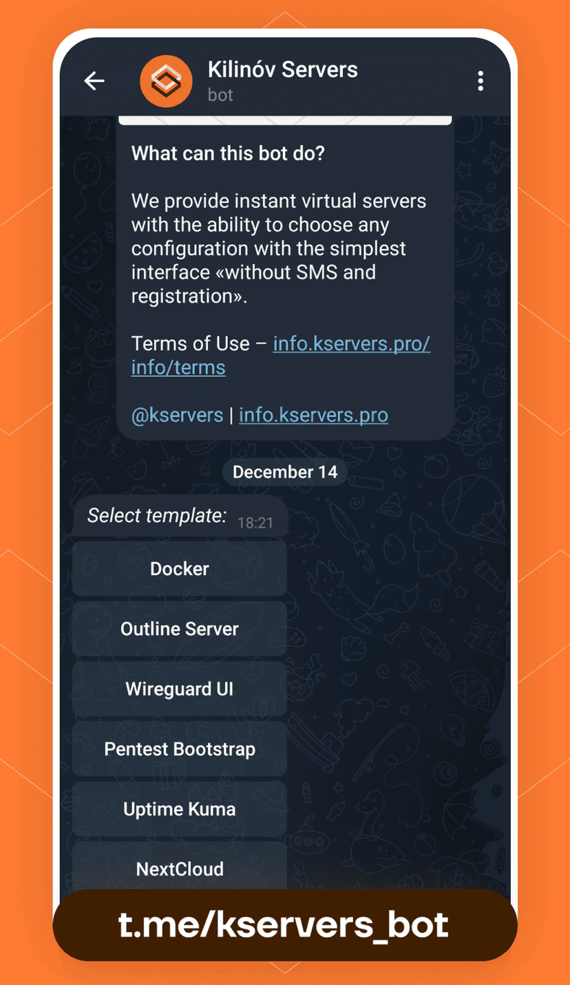 Kilinóv Servers предоставляет мгновенную аренду виртуальных серверов прямо в Telegram без регистрации и верификации. Сервера стартуют за считанные секунды, а оплата доступна через TON, CryptoBot, xRocket, банковские карты, СБП или Telegram Stars.