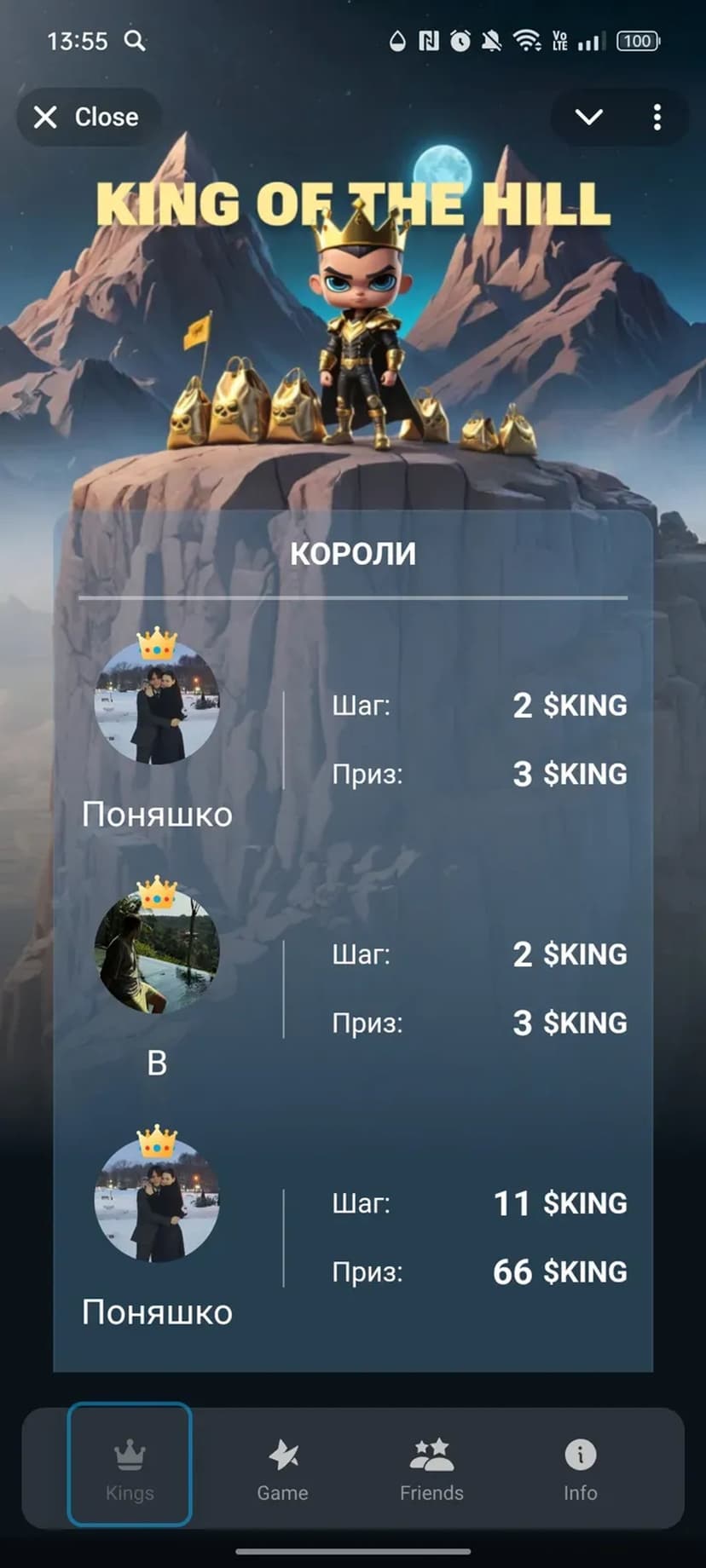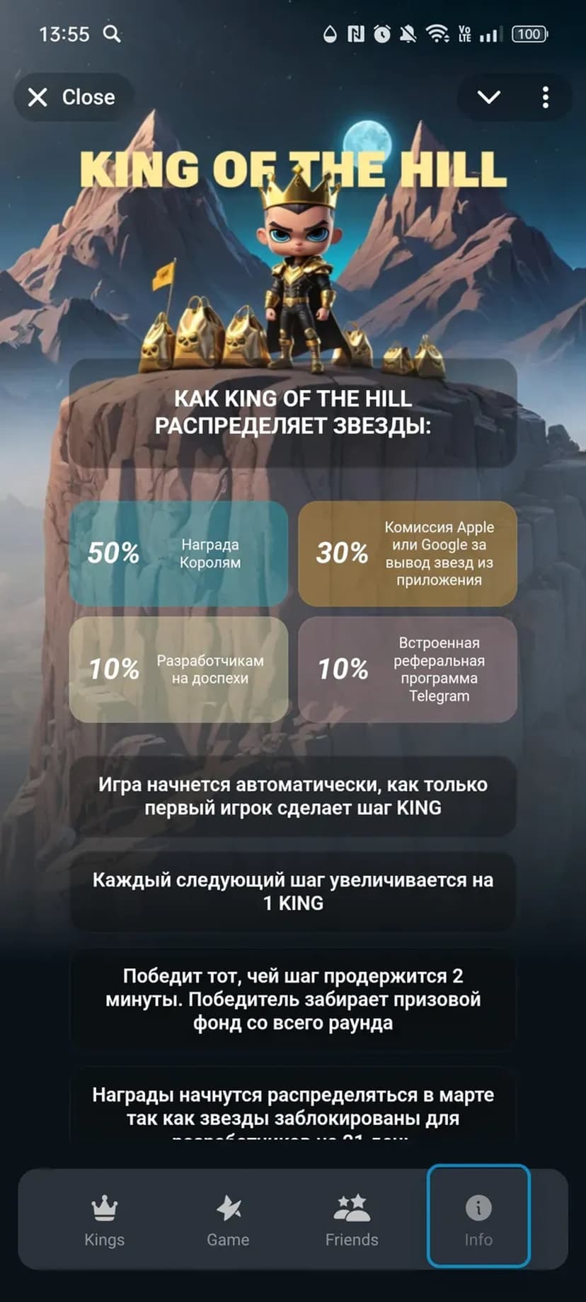 King of the Hill π β ΡΠΎΡΠ΅Π²Π½ΠΎΠ²Π°ΡΠ΅Π»ΡΠ½Π°Ρ ΠΌΠΈΠ½ΠΈβΠΈΠ³ΡΠ° Π²Π½ΡΡΡΠΈ Telegram, Π³Π΄Π΅ ΠΈΠ³ΡΠΎΠΊΠΈ ΠΏΠ»Π°ΡΡΡ ΡΡΠ°Π²ΠΊΠΈ Π² TON, ΡΡΠΎΠ±Ρ ΡΡΠ°ΡΡ ΠΈ ΠΎΡΡΠ°Π²Π°ΡΡΡΡ Β«ΠΊΠΎΡΠΎΠ»ΡΠΌ Π³ΠΎΡΡΒ». ΠΠΎΠ±Π΅Π΄ΠΈΡΠ΅Π»Ρ ΠΎΠΏΡΠ΅Π΄Π΅Π»ΡΠ΅ΡΡΡ Π²ΡΠ΅ΠΌΠ΅Π½Π΅ΠΌ ΠΏΡΠ°Π²Π»Π΅Π½ΠΈΡ: ΠΈΠΌΡ ΠΈΠ³ΡΠΎΠΊΠ° ΠΎΡΠΎΠ±ΡΠ°ΠΆΠ°Π΅ΡΡΡ Π² ΡΡΠ°ΡΡΡΠ΅ ΠΊΠΎΡΠΎΠ»Ρ, Π° ΡΠ°ΠΉΠΌΠ΅Ρ ΠΎΡΡΡΠΈΡΡΠ²Π°Π΅Ρ Π΅Π³ΠΎ ΠΏΠ΅ΡΠΈΠΎΠ΄. ΠΡΠ±ΠΎΠΉ ΡΡΠ°ΡΡΠ½ΠΈΠΊ ΠΌΠΎΠΆΠ΅Ρ ΠΏΠΎΠΏΡΡΠ°ΡΡΡΡ Π·Π°Ρ Π²Π°ΡΠΈΡΡ ΡΡΠΎΠ½, ΡΠ΄Π΅Π»Π°Π² ΡΡΠ°Π²ΠΊΡ Π±ΠΎΠ»ΡΡΠ΅ ΡΠ΅ΠΊΡΡΠ΅ΠΉ.