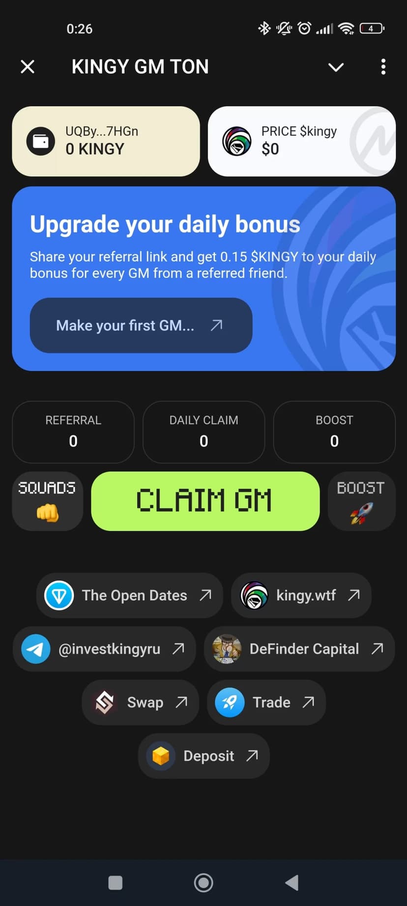 KINGY GM BATTLE — проект на базе блокчейна The Open Network (TON), объединяющий автоматизированный майнинг, ограниченную NFT‑коллекцию и игровые с рекламными сервисы внутри экосистемы Investkingyru. Телеграм‑бот предоставляет возможность зарабатывать $KINGY с минимальными усилиями.