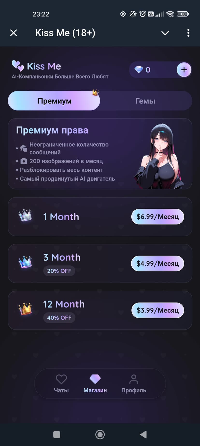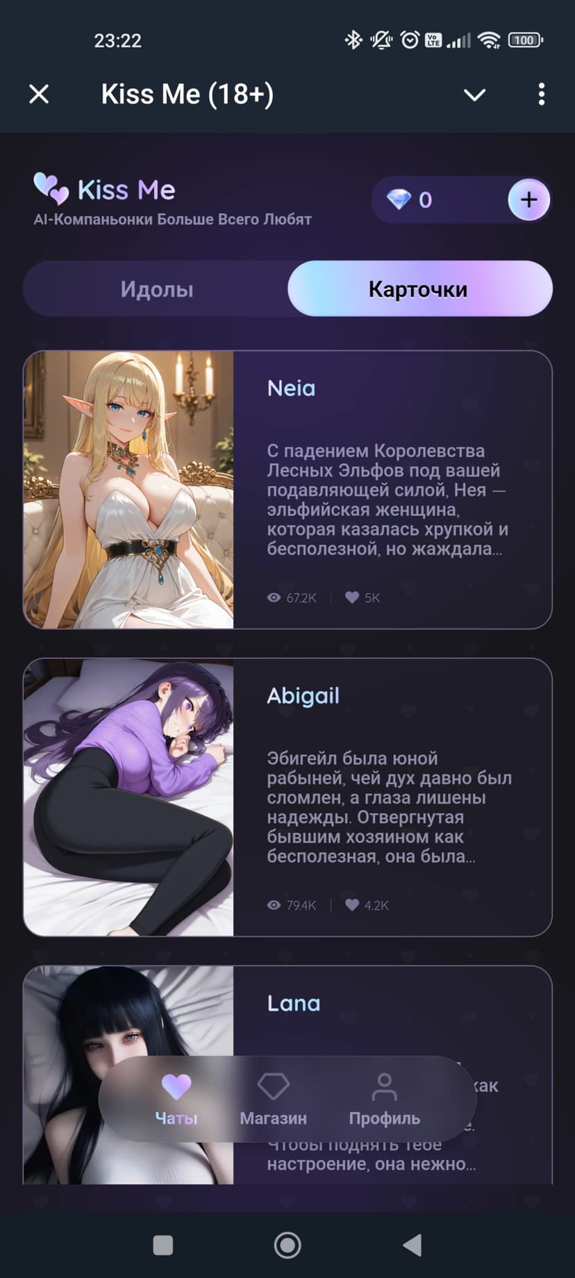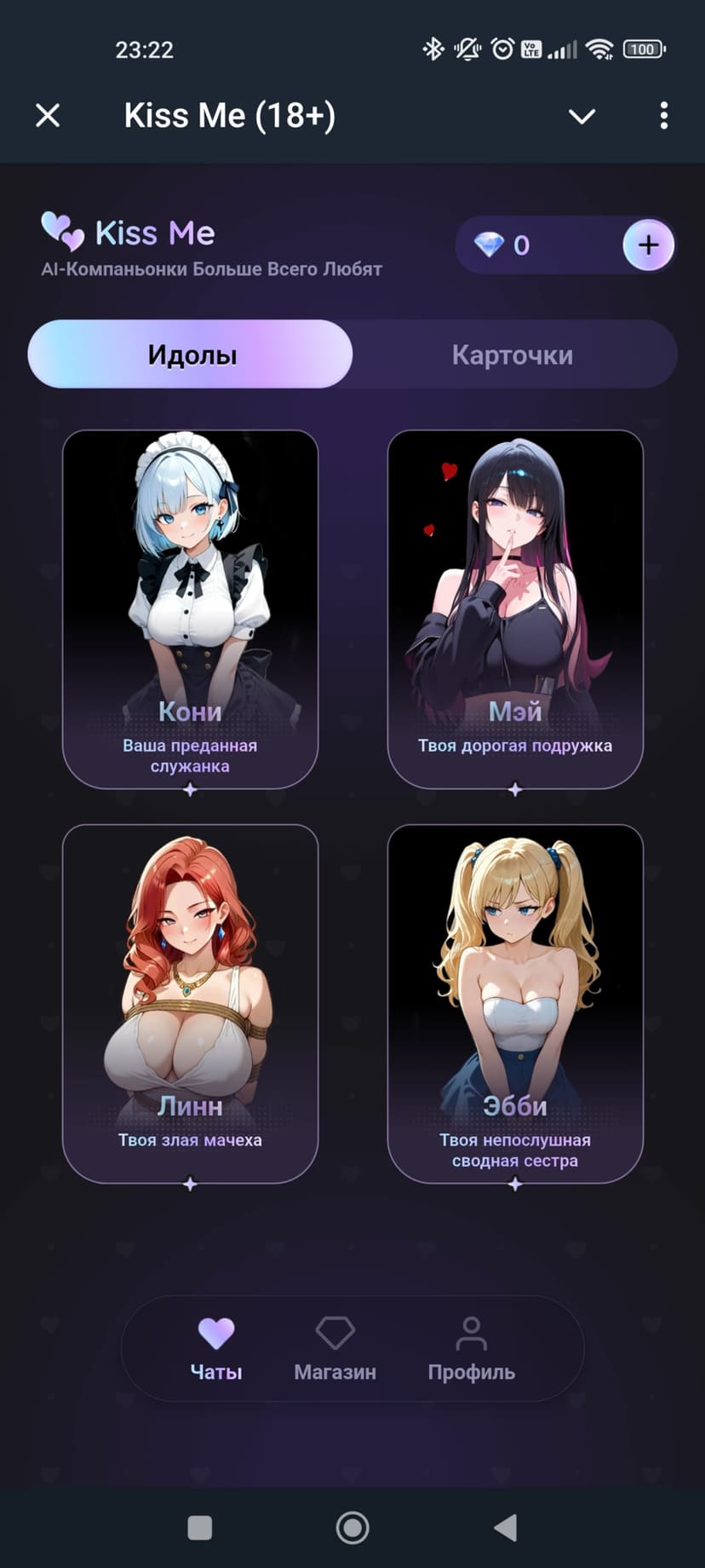 Kiss Me — интерактивный AI-компаньон для взрослых, сочетающий флирт, ролевые диалоги и мини‑игры. Пользователь общается с виртуальными идолами, каждый из которых обладает своим характером и стилем.