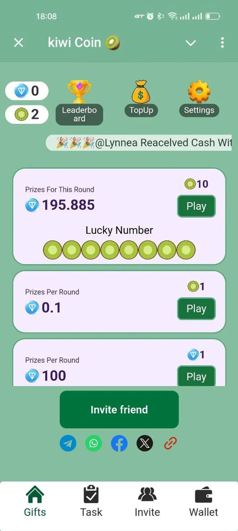 Kiwi Coin — мини‑приложение в Telegram для участия в ежедневных розыгрышах и заработка криптовалюты TON. Пользователи выполняют простые задания, получают внутриигровую валюту Kiwi Coin и получают шанс выиграть TON.