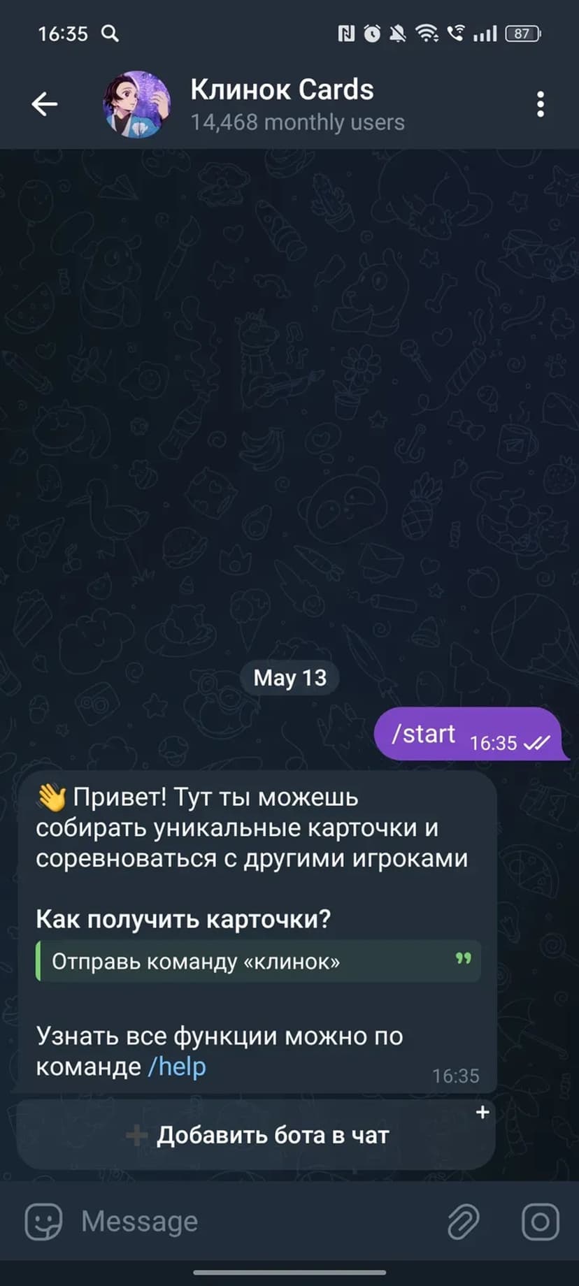 Клинок Cards — коллекционная карточная PvP-игра, реализованная через Telegram-бот. Игроки собирают уникальные карты, прокачивают персонажей, сражаются с другими участниками, выполняют ежедневные задания и участвуют в регулярных ивентах.