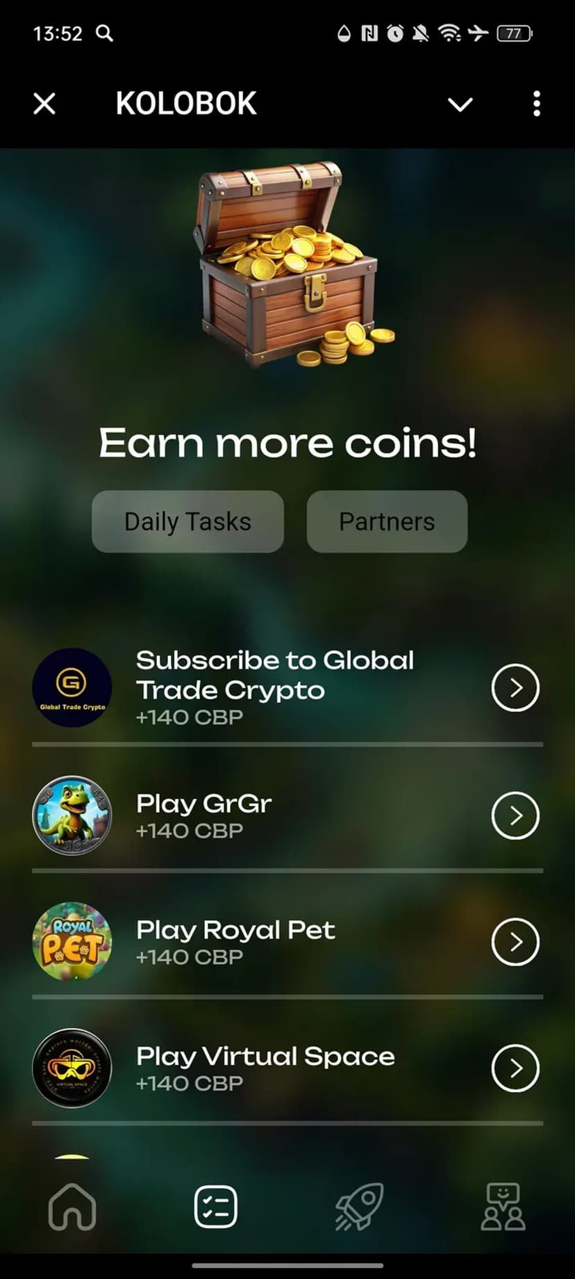 KOLOBOK — мини‑приложение в Telegram для накопления внутренних баллов CB Points. Игроки совместно зарабатывают очки, которые можно использовать для получения наград и участия в активностях проекта.