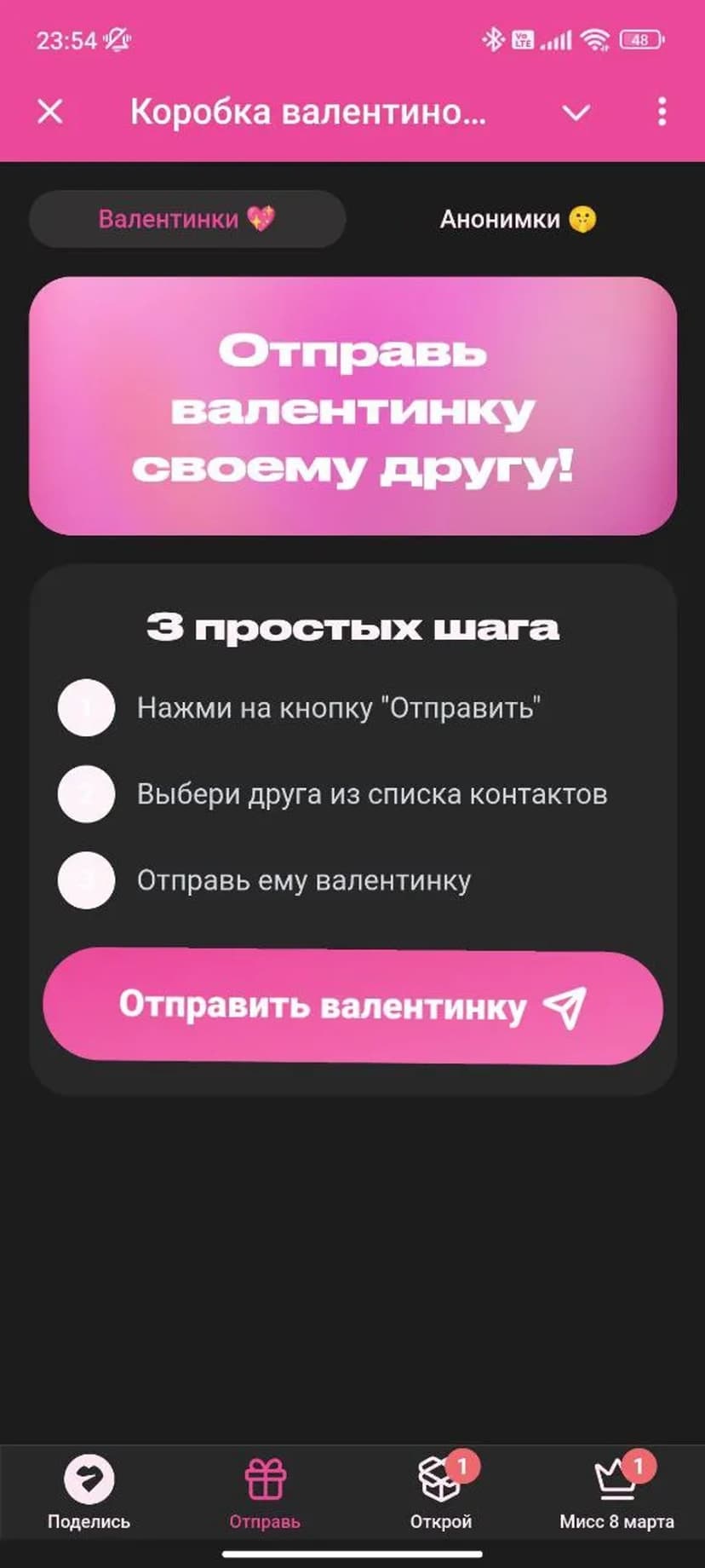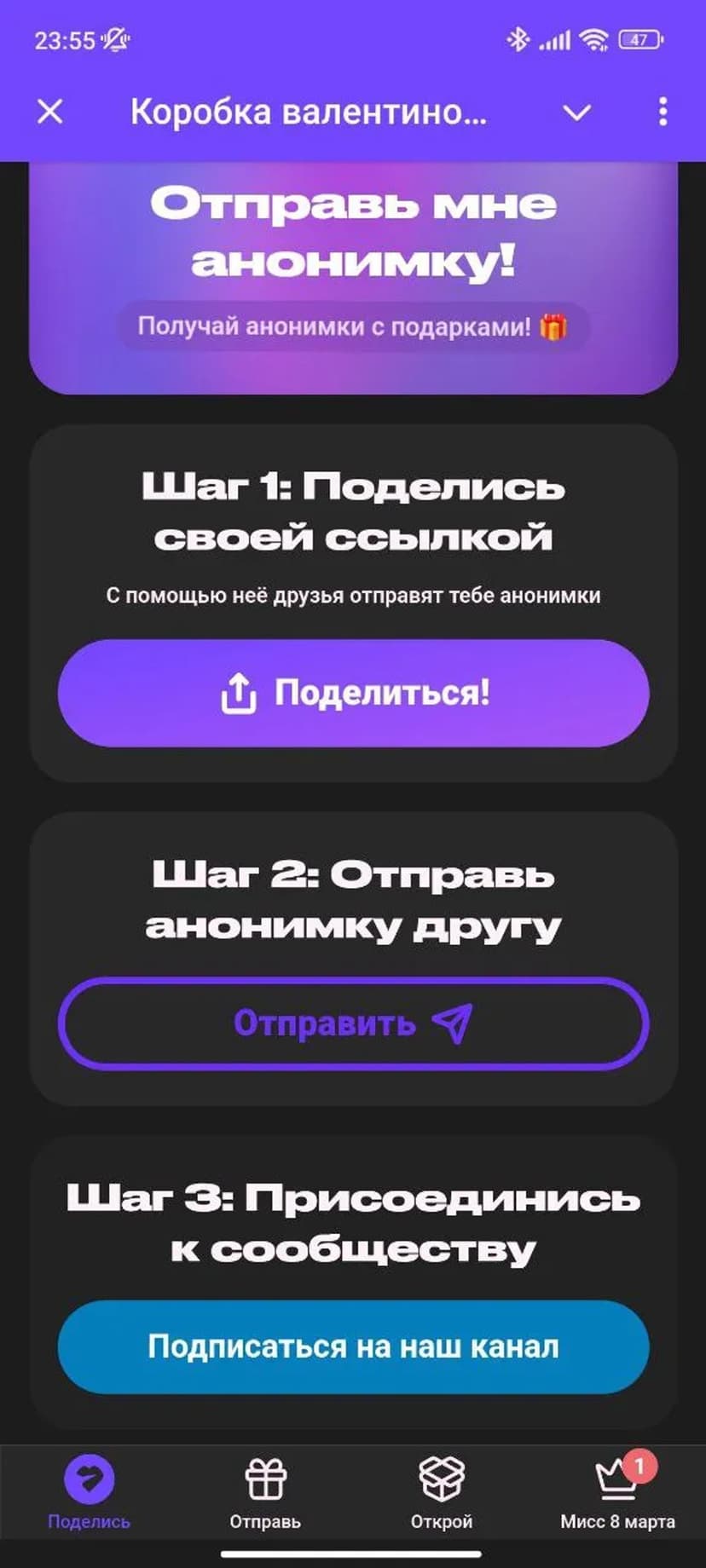 Коробка анонимок — игровая система в Telegram, где можно создать личную виртуальную коробку для сбора секретных валентинок от друзей. После создания вы получаете уникальную ссылку, которой можно поделиться.