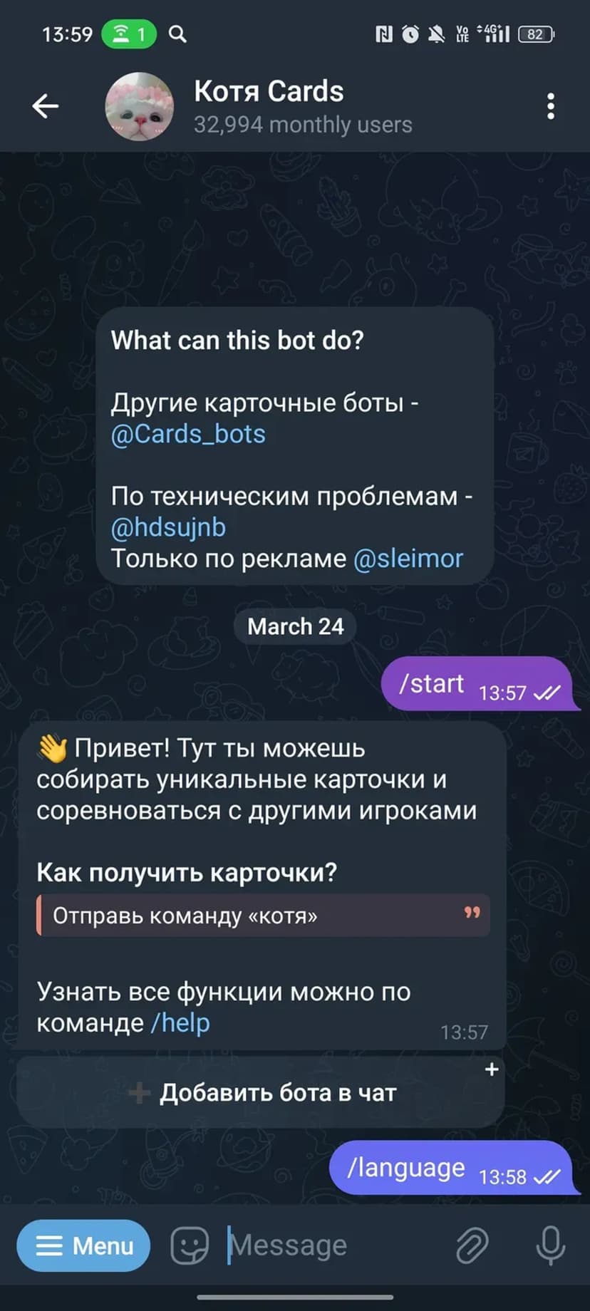 Котя Cards предоставляет набор карточных игр, которые можно запускать прямо в чате. Пользователи создают приватные столы, присоединяются к открытым партиям, приглашают друзей и участвуют в быстрых матчах с системой рейтингов.