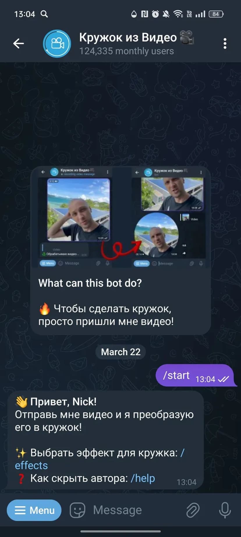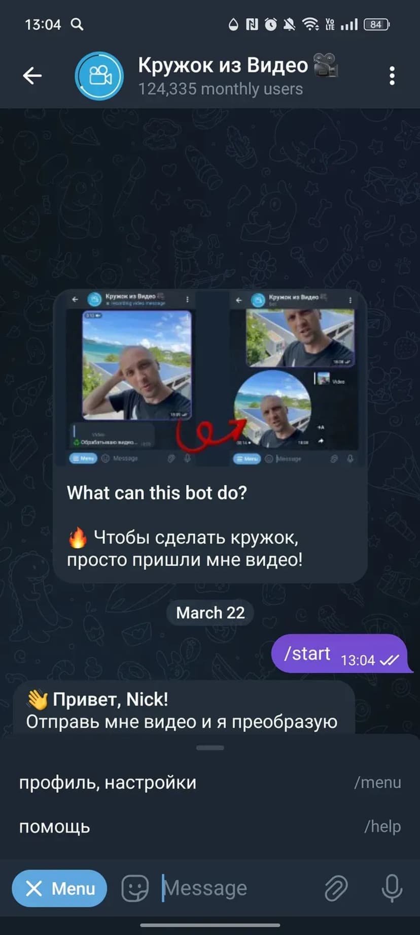Кружок из Видео 🎥 быстрo конвертирует обычные видео в формат «кружок» — нативный вид видеосообщений в Telegram, готовый к отправке в чатах.