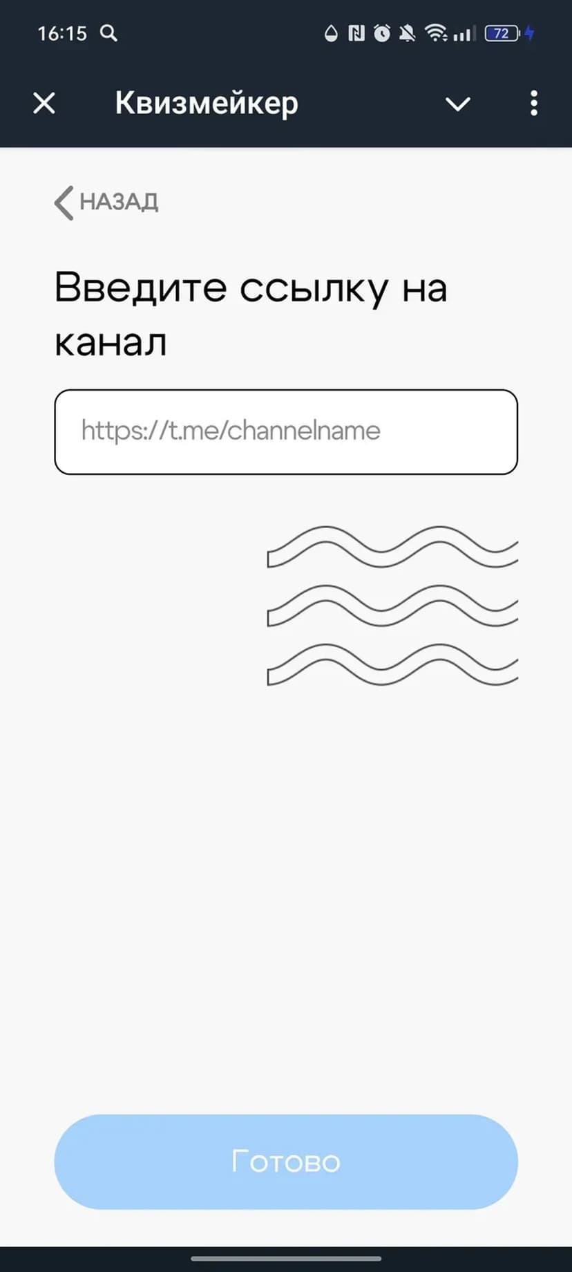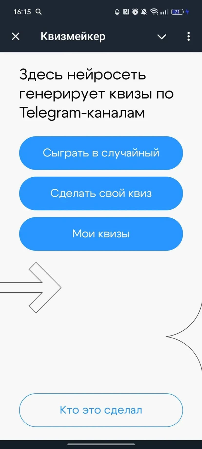 Квизмейкер формирует тематические квизы автоматически на основе текста выбранного открытого Telegram-канала. Пользователю достаточно указать ссылку на канал — приложение проанализирует контент и создаст уникальную подборку вопросов без ручной подготовки.