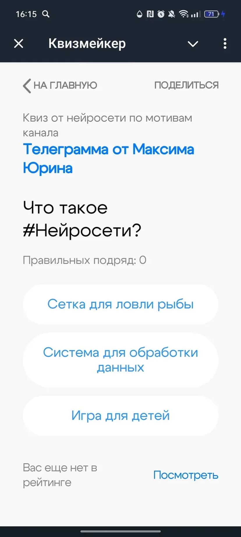 - Быстрая генерация: квизы создаются мгновенно по любым открытым каналам.
