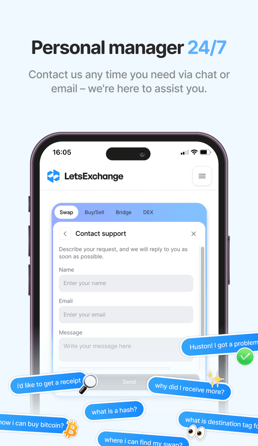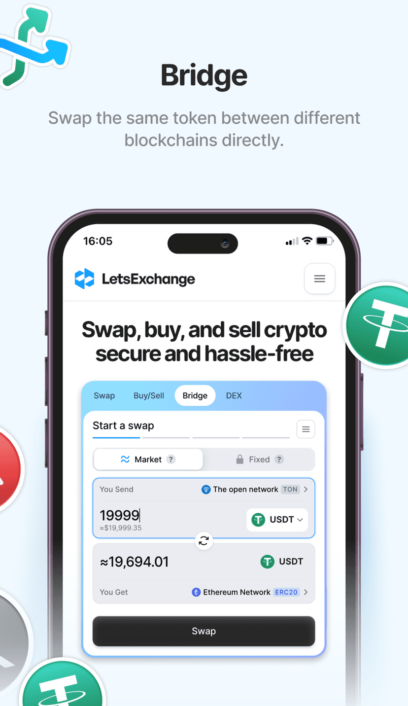 LetsExchange.io обеспечивает быстрый и безопасный обмен более 5,000 монет и токенов (включая BTC, ETH, TON) и конвертацию с более чем 60 фиатными валютами. Доступны классические свопы, DEX-операции, кроссчейн и бридж для расширения возможностей обмена.