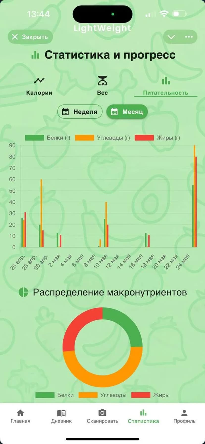- Ведение дневника питания и отчёты по дням