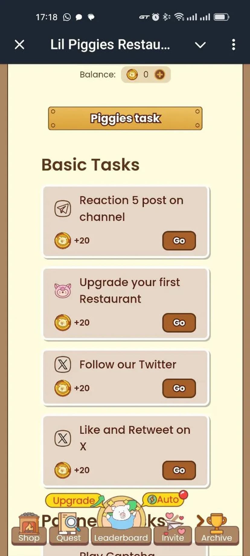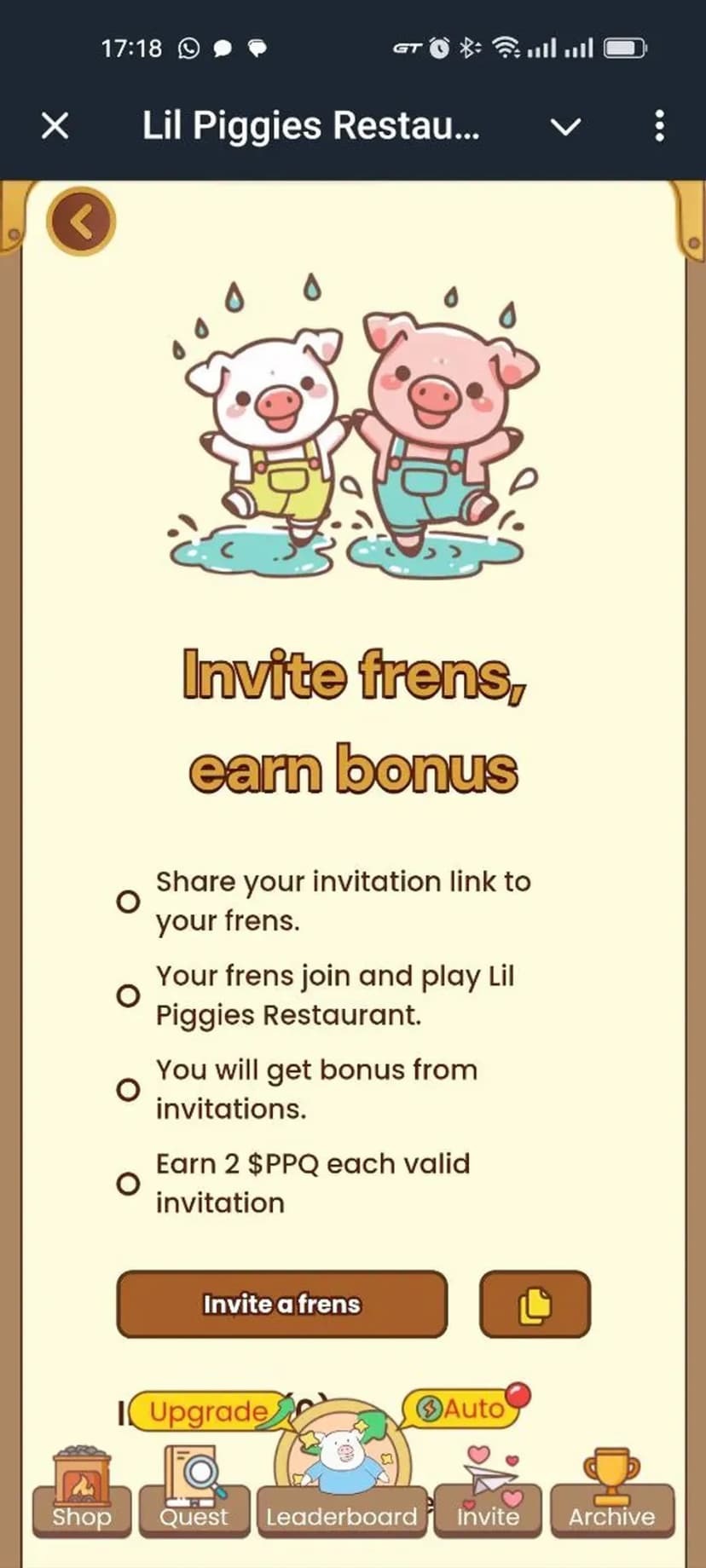Lil Piggies Restaurant — мини‑игра в Telegram, объединяющая элементы менеджмента и кликера. Вы развиваете виртуальный ресторан, улучшаете помещения и получаете внутриигровую валюту $PPQ, которую можно обменивать на реальные призы или тратить на дальнейшее развитие игрового процесса.