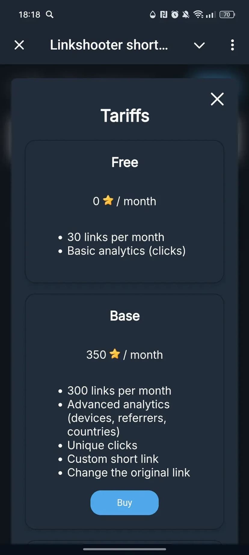 *Нажимая "Открыть в Telegram", вы перейдете к приложению Linkshooter short lin в мессенджере Telegram