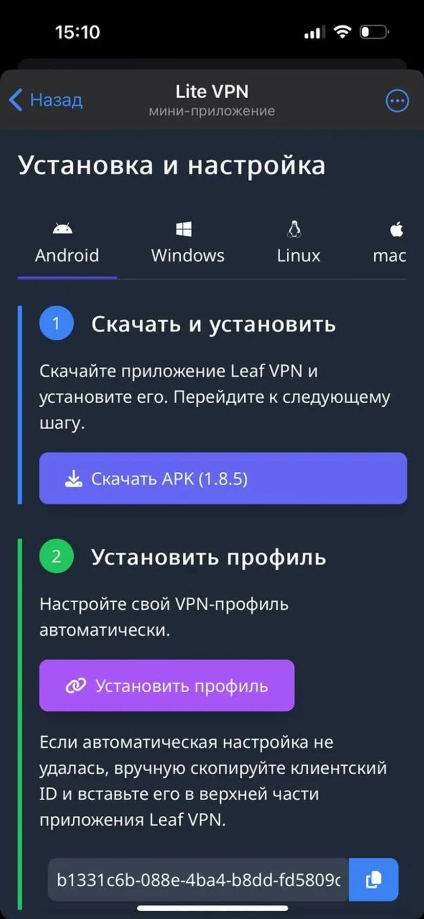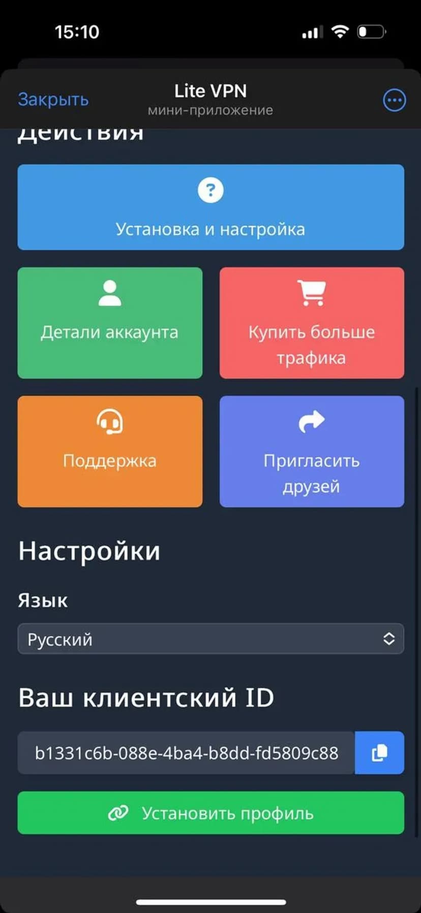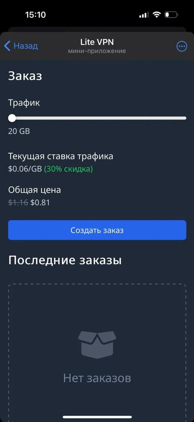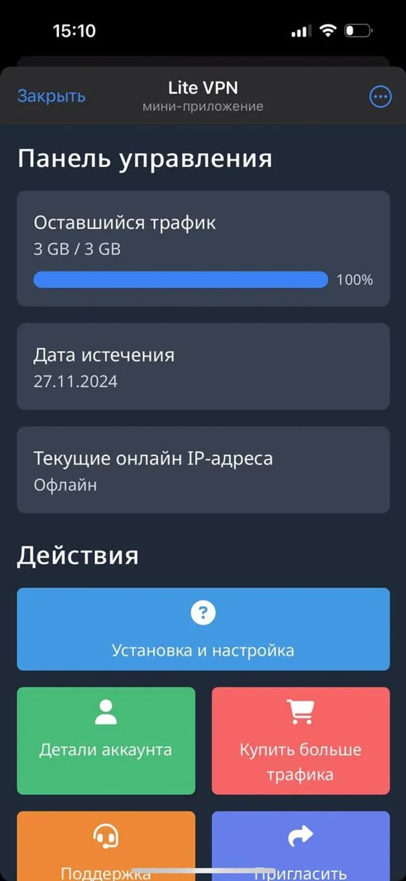 Lite VPN предоставляет доступ к VPN-сервису внутри Telegram через Mini Apps API. После авторизации через Telegram вы получаете 3 ГБ бесплатного трафика на одну неделю, чтобы оценить стабильность соединения и скорость без установки дополнительного ПО.