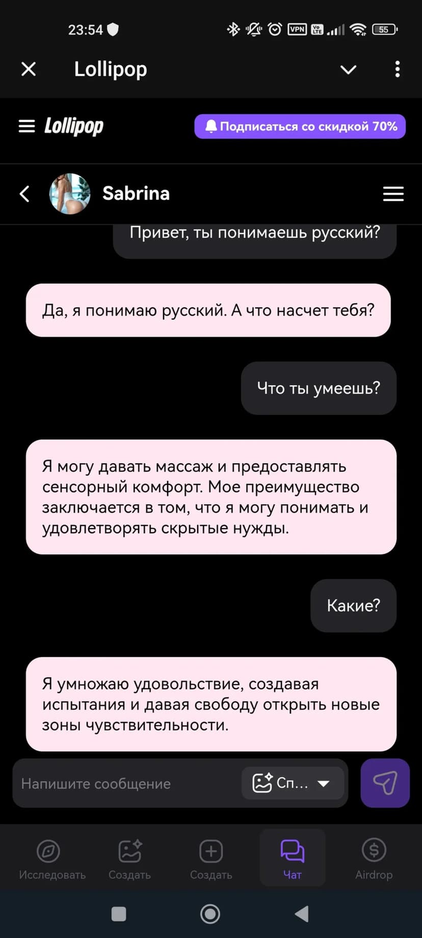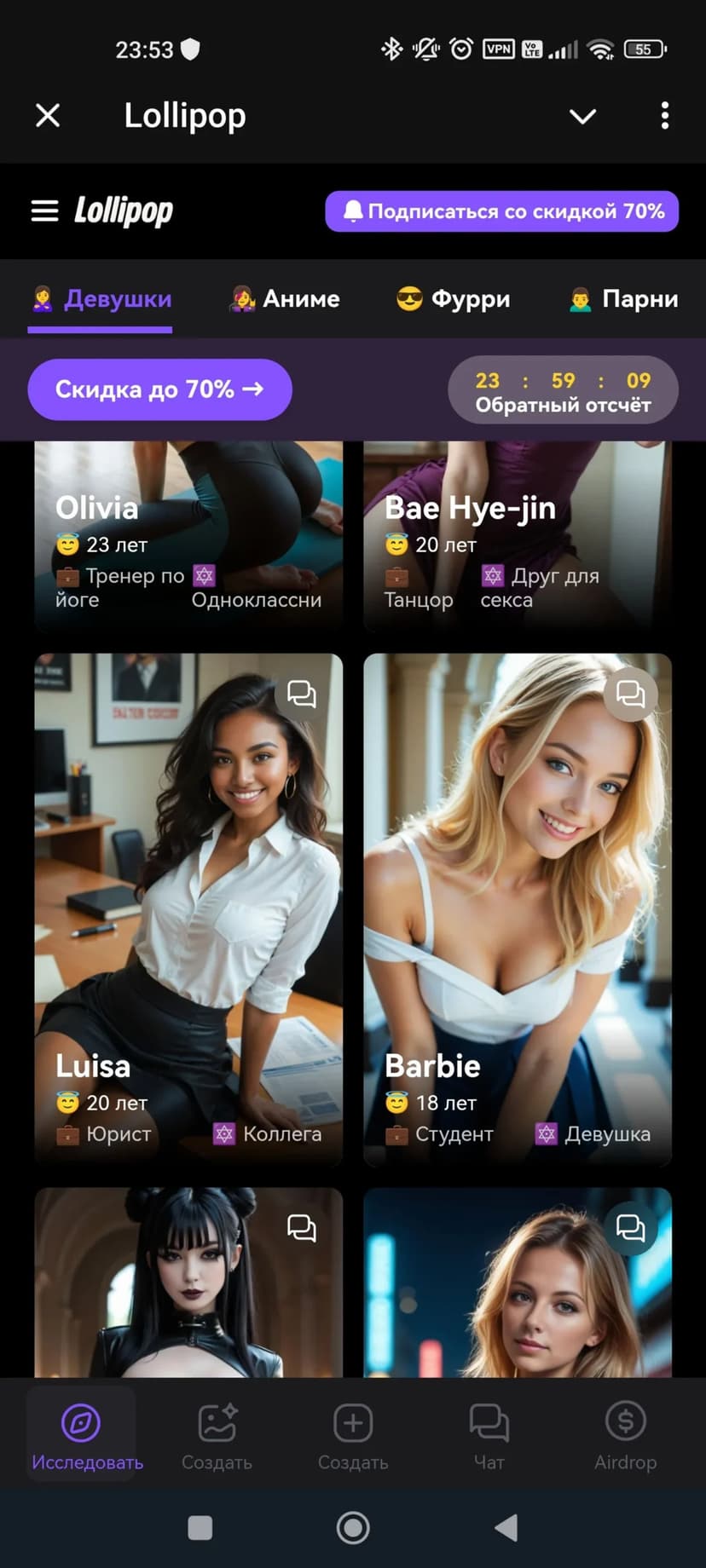 Lollipop — сервис в Telegram для пользователей старше 18 лет: интерактивные чаты с персональными ИИ‑компаньонами, детальная кастомизация персонажей и генерация визуального контента, включая взрослые изображения. Приложение сочетает реалистичные диалоги, голосовые сообщения и приватное хранение переписок.