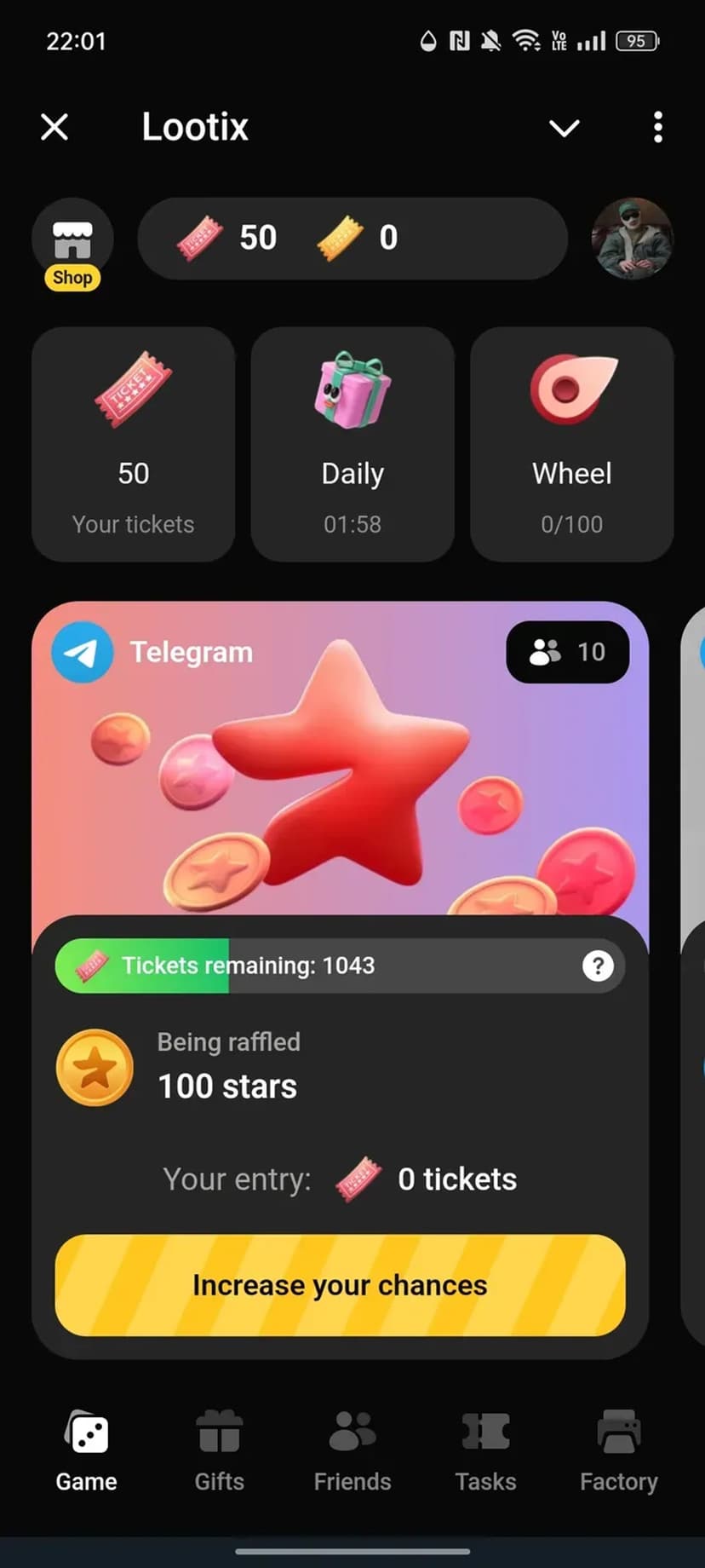Lootix — бот, интегрированный с Telegram, для участия в розыгрышах и сбора билетов. При регистрации пользователю выдаются стартовые билеты, которые применяются для входа в раффлы.