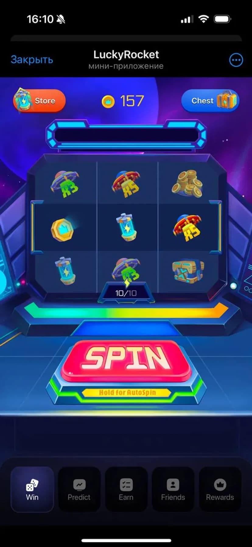 Прогнозы курса BTC с наградами $ROCKET, слот‑машина, лидерборды и сундуки
