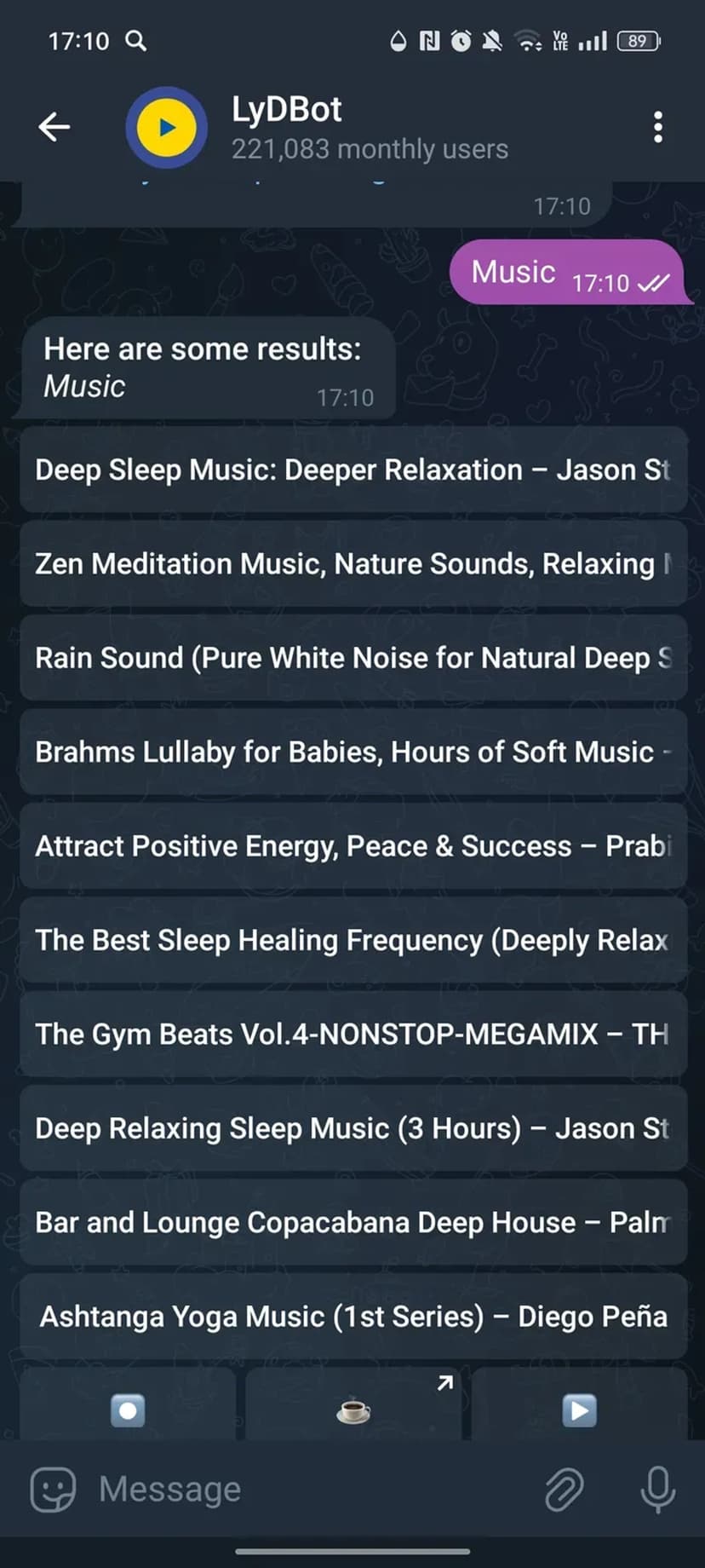LyDBot — Telegram‑бот для быстрого поиска сведений о музыкальных композициях и текстах песен. Пользователь отправляет текстовый запрос (имя исполнителя, название трека или фрагмент строки), а бот возвращает релевантные результаты в виде сообщений.