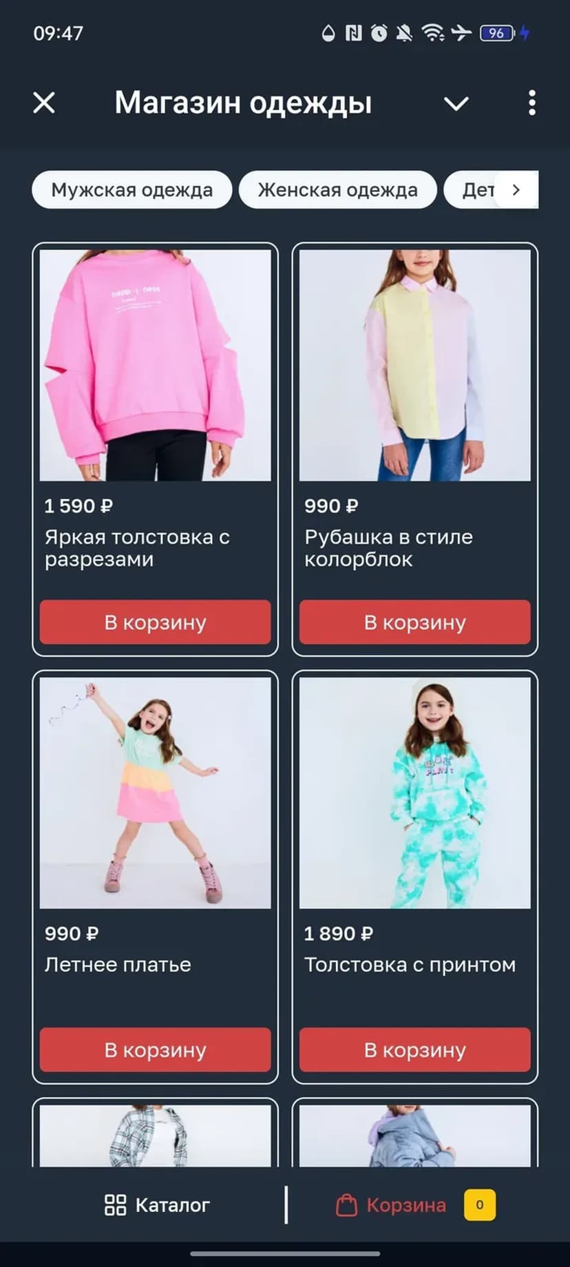 Магазин одежды объединяет все этапы онлайн‑продажи внутри мессенджера: просмотр каталога, добавление в корзину и оформление заказа с оплатой.