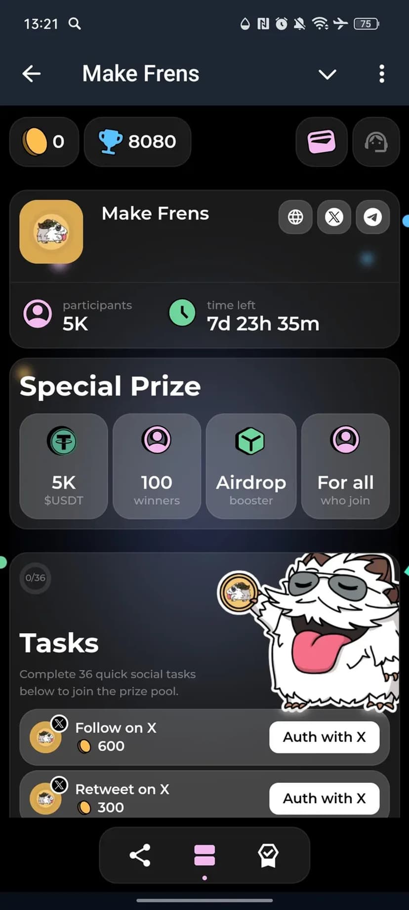 - Список заданий с указанием вознаграждения (USDT, Fren Coin и др.) и требуемых действий: подписка, лайк, вступление в сообщество.