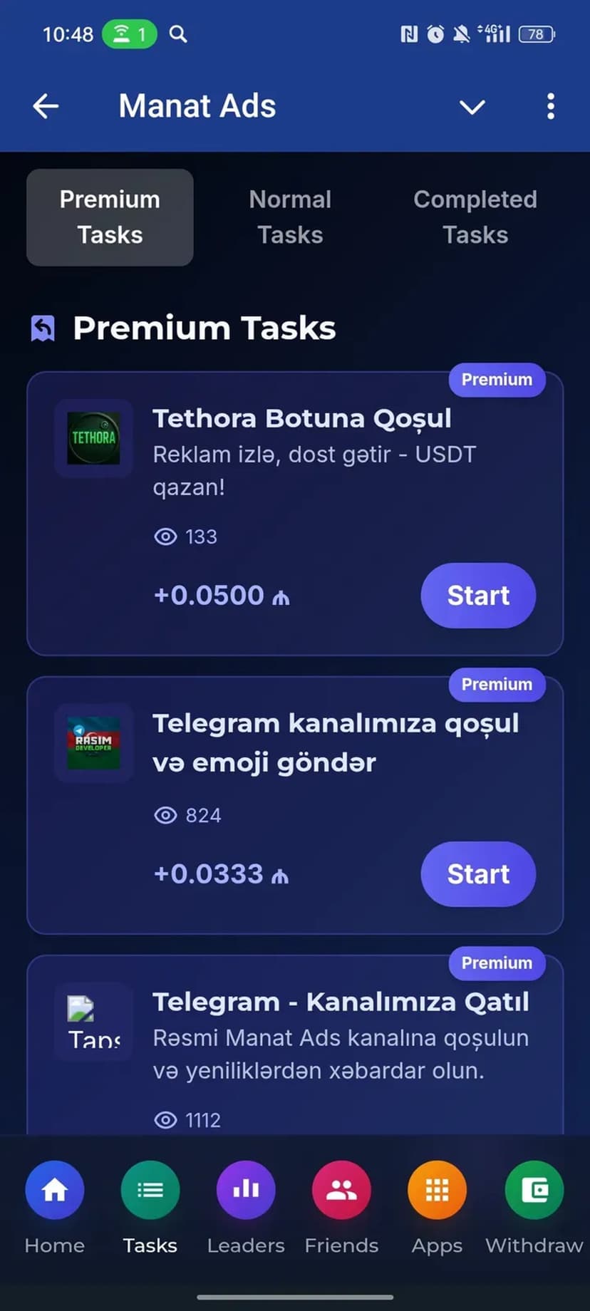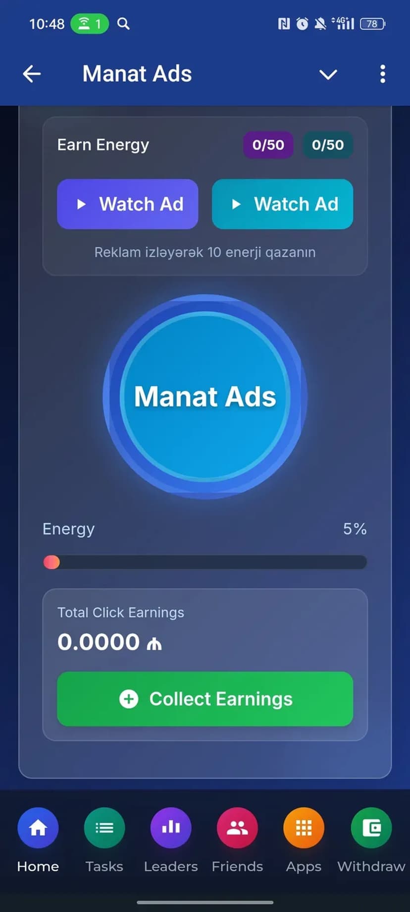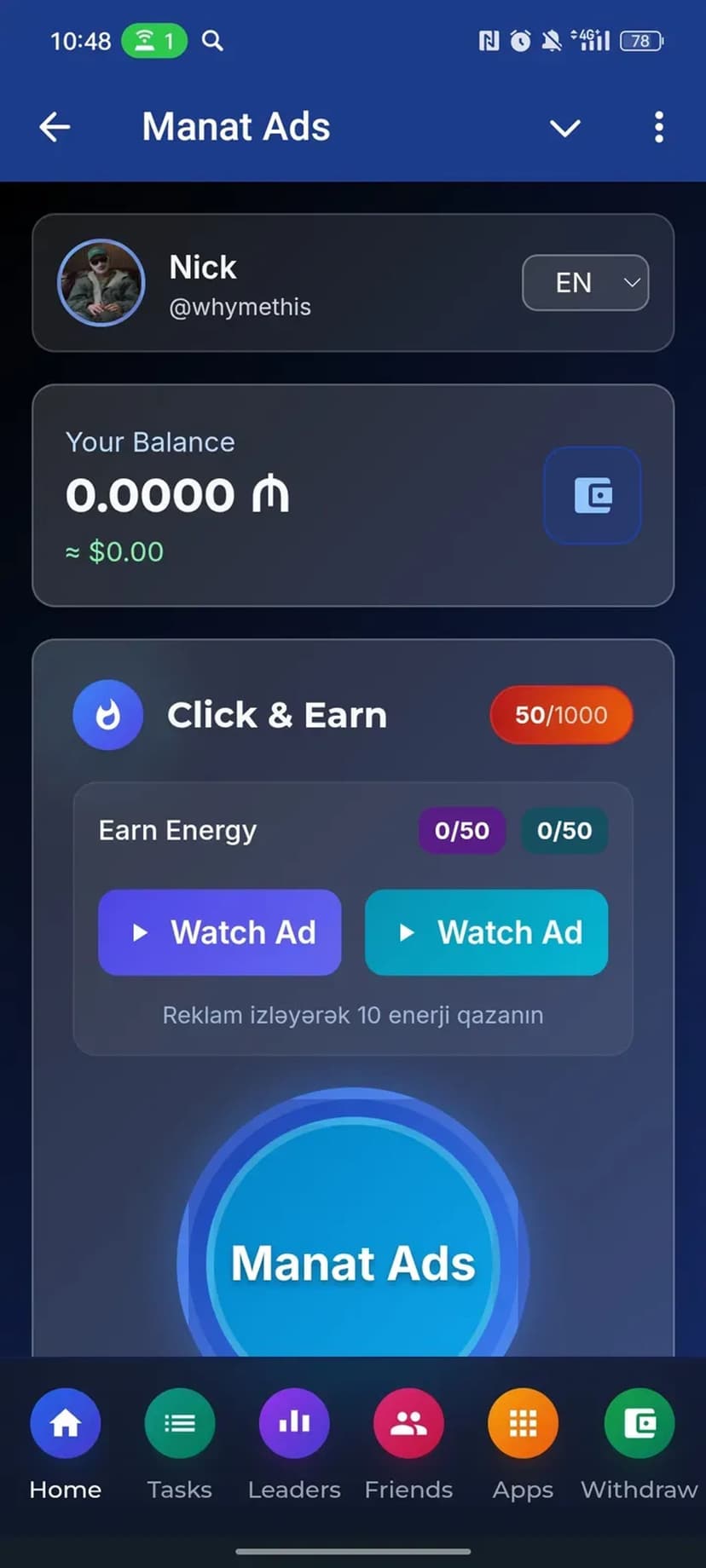 Manat Ads — мини‑приложение для получения небольшого дохода внутри Telegram через выполнение простых заданий и игровые механики.