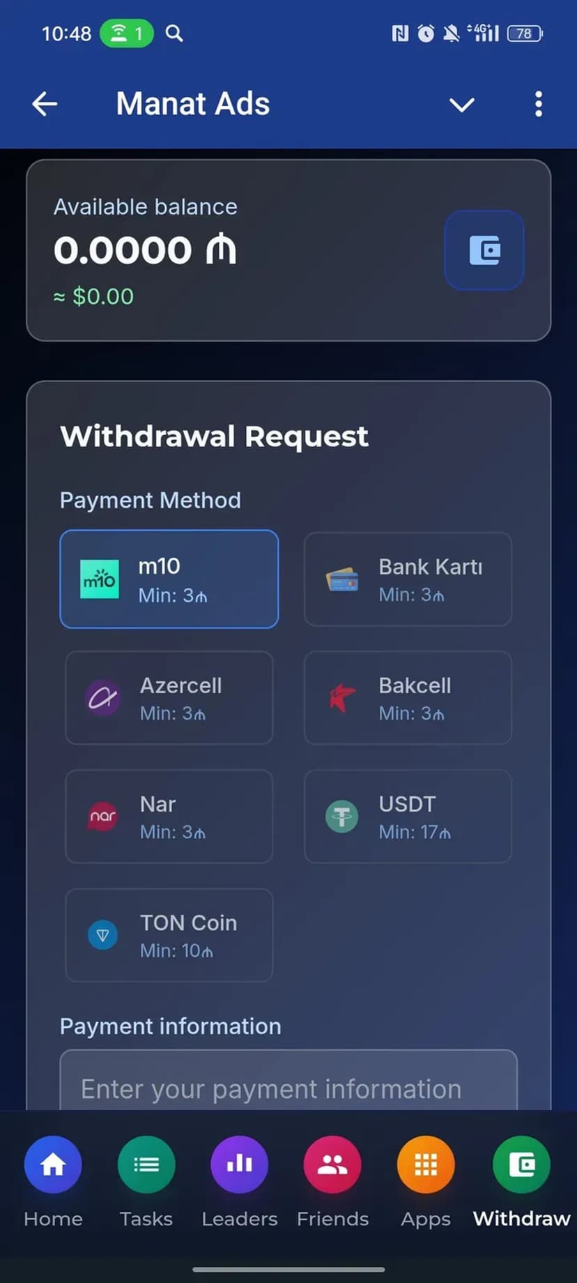 Технические детали: приложение работает через Mini App API и использует авторизацию Telegram без отдельной регистрации. Начисление вознаграждений происходит мгновенно, а вывод средств реализован через популярные и локальные платёжные системы. Manat Ads делает упор на азербайджанскую аудиторию и сочетает задания с игровыми элементами.