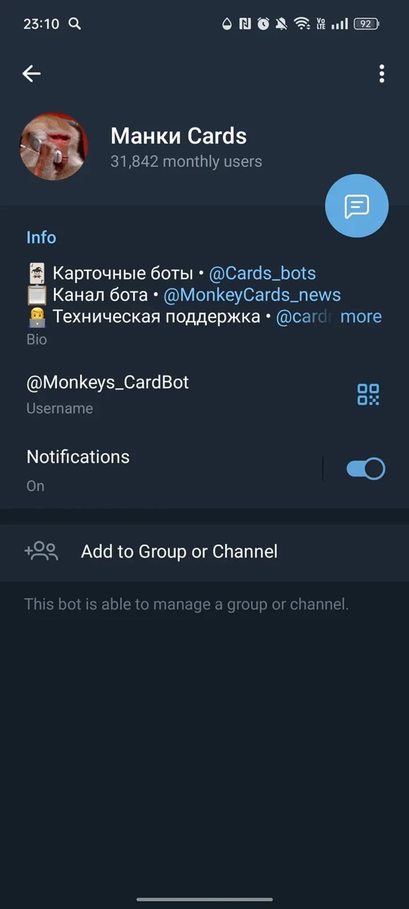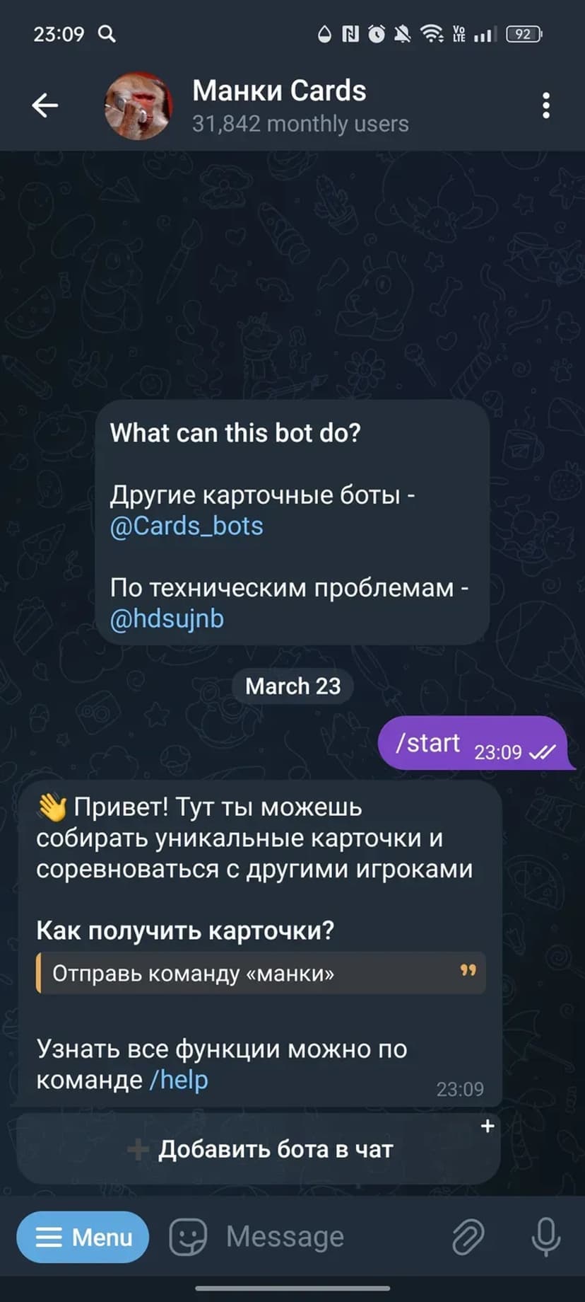 Манки Cards — бот для проведения карточных игр прямо внутри чатов и групп Telegram. Сервис поддерживает популярные карточные правила и выполняет игровой процесс автоматически, чтобы игроки могли сосредоточиться на партии без перехода на внешние платформы.