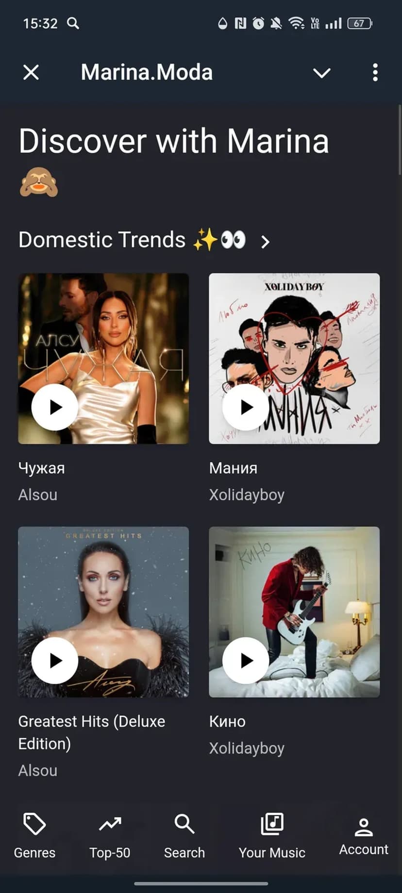 Marina.Moda — платформа для обмена музыкальными треками и видеоконтентом, где пользователи открывают новых исполнителей, делятся находками и объединяются в тематические сообщества.