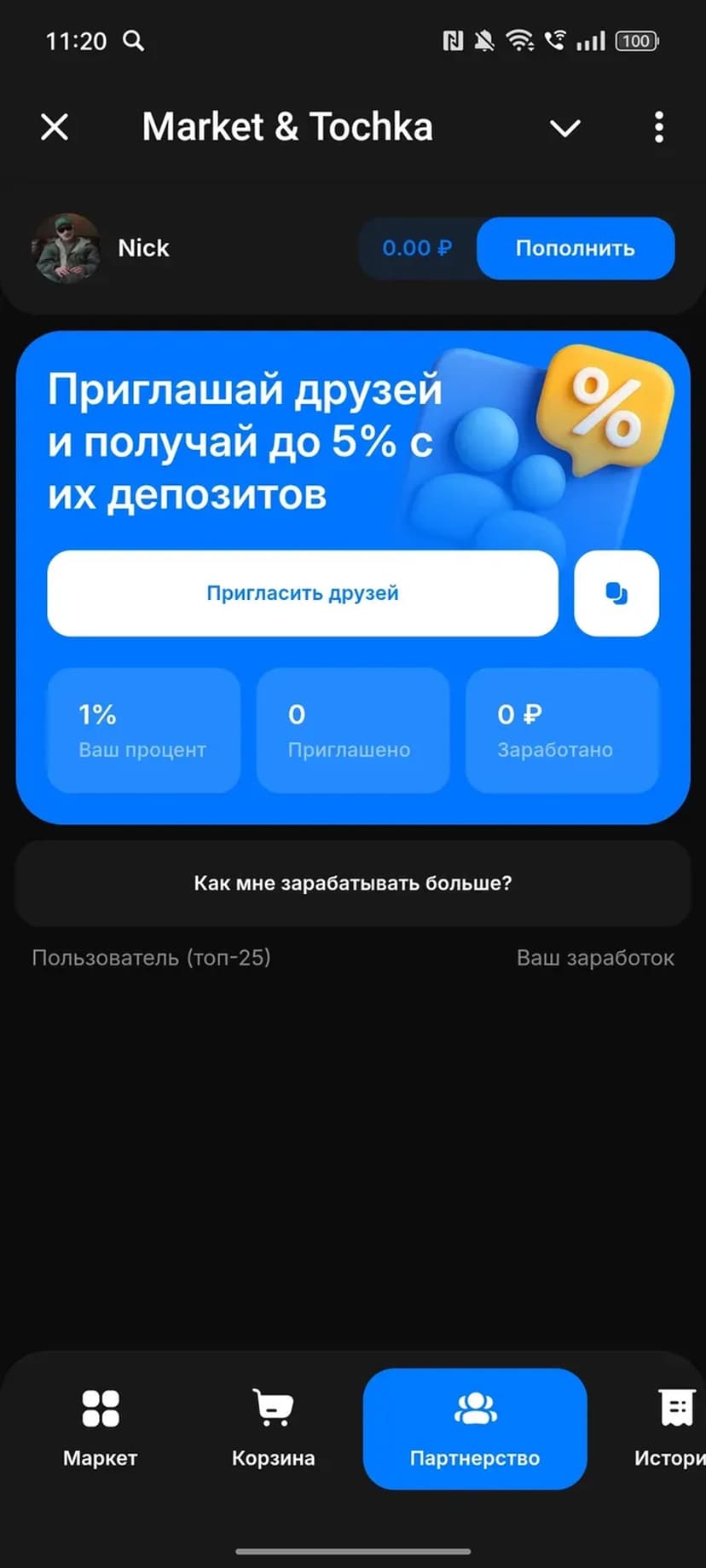 - Реферальная система с начислением до 5% от депозитов приглашённых пользователей