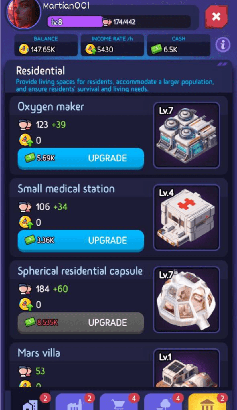 - Развивайте разные типы построек для стабильного притока Mars Coins.