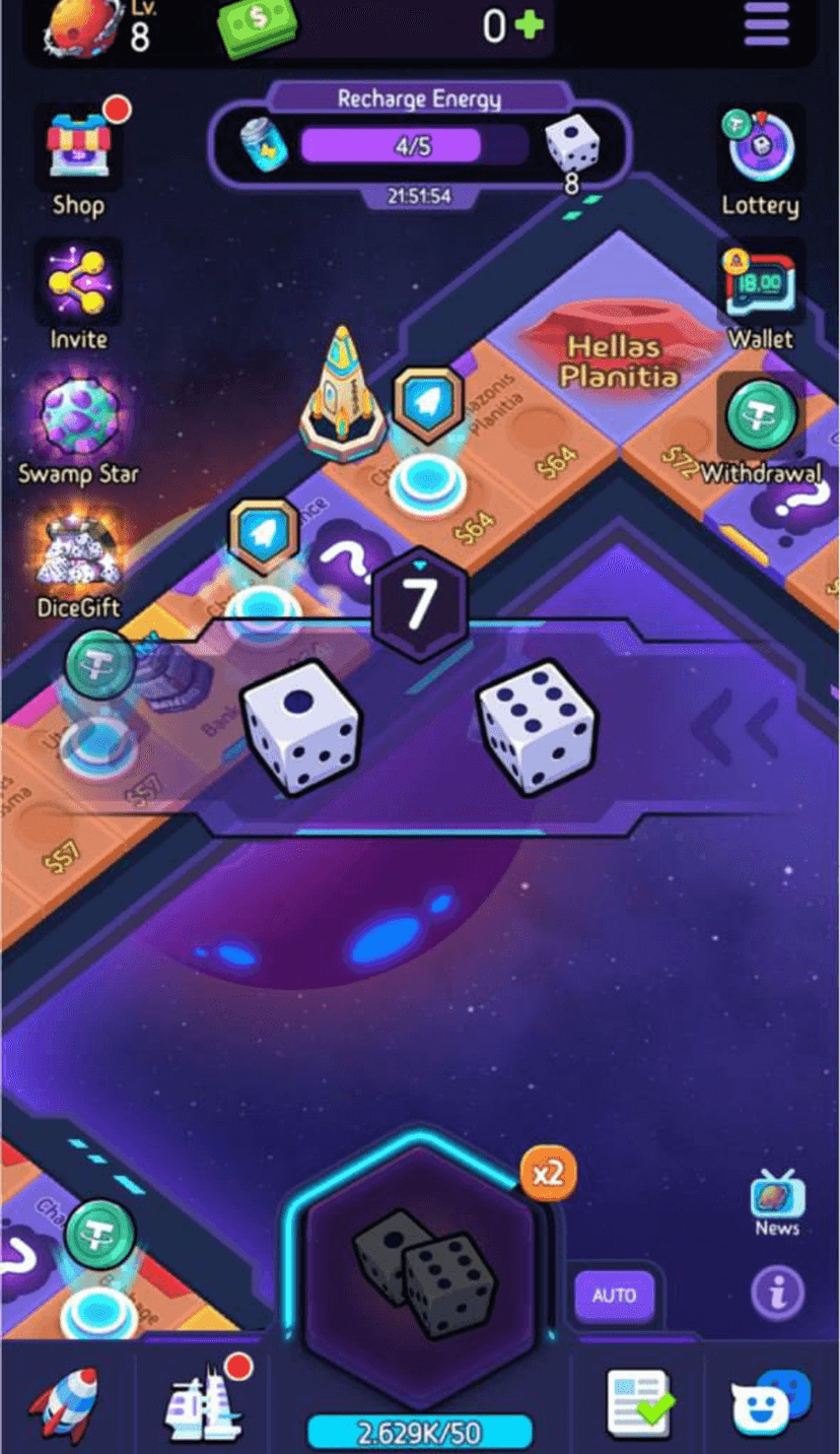 Прогресс зависит от бросков кубика: после хода вы вкладываете средства в один из пяти типов построек, включая жилые модули, исследовательские лаборатории и ресурсо‑добывающие комплексы. Каждое здание генерирует внутриигровые Mars Coins, которые можно обменять на реальные награды (USDT).