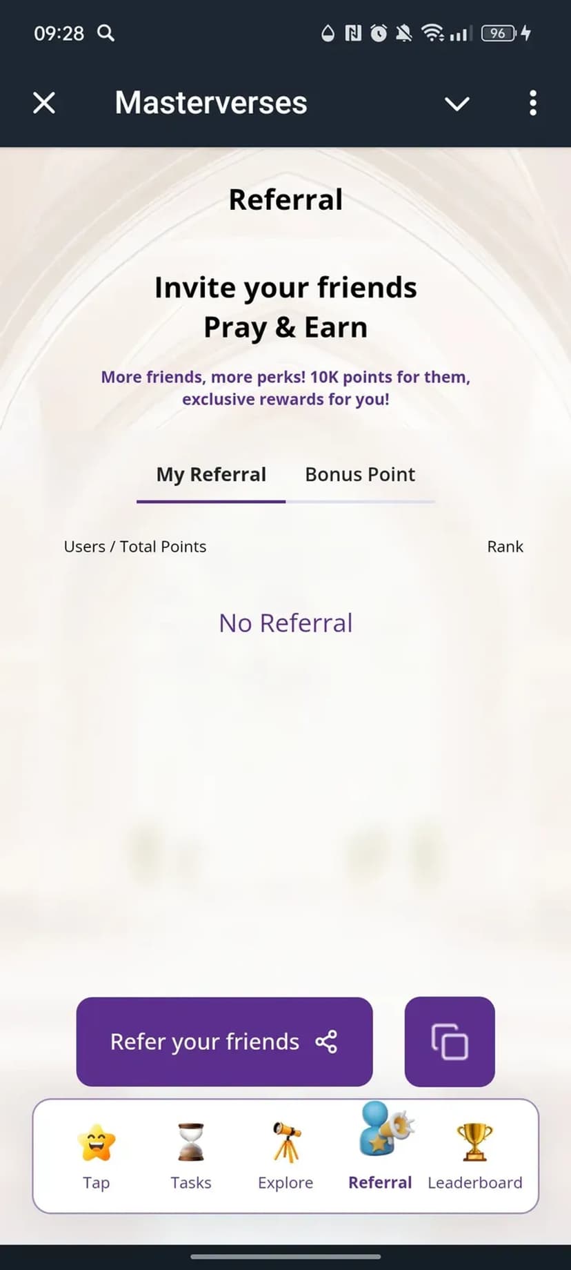 Masterverses сочетает элементы духовности и механики вознаграждений: пользователи выполняют ежедневные задания, получают аирдропы и участвуют в реферальных программах, за что начисляются внутренние баллы (Masterverses points) по принципу «нажми — помолись — заработай».